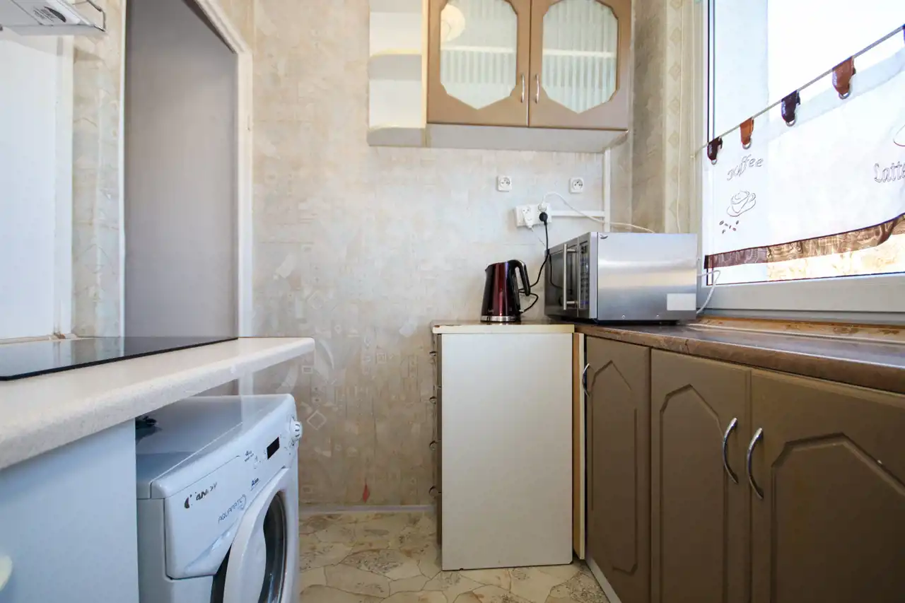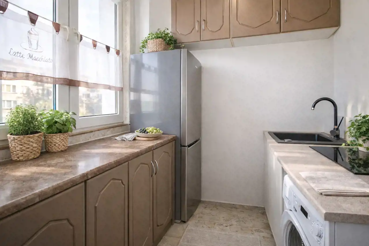 - oddzielna, widna kuchnia z meblami w zabudowie, zlewem, płytą indukcyjną oraz pralką,