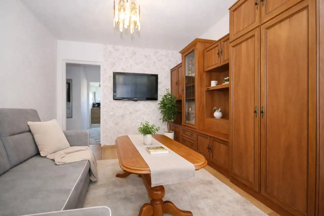 - salon wyposażony w kanapę, stół, meblościankę oraz telewizor, z wyjściem na balkon,
