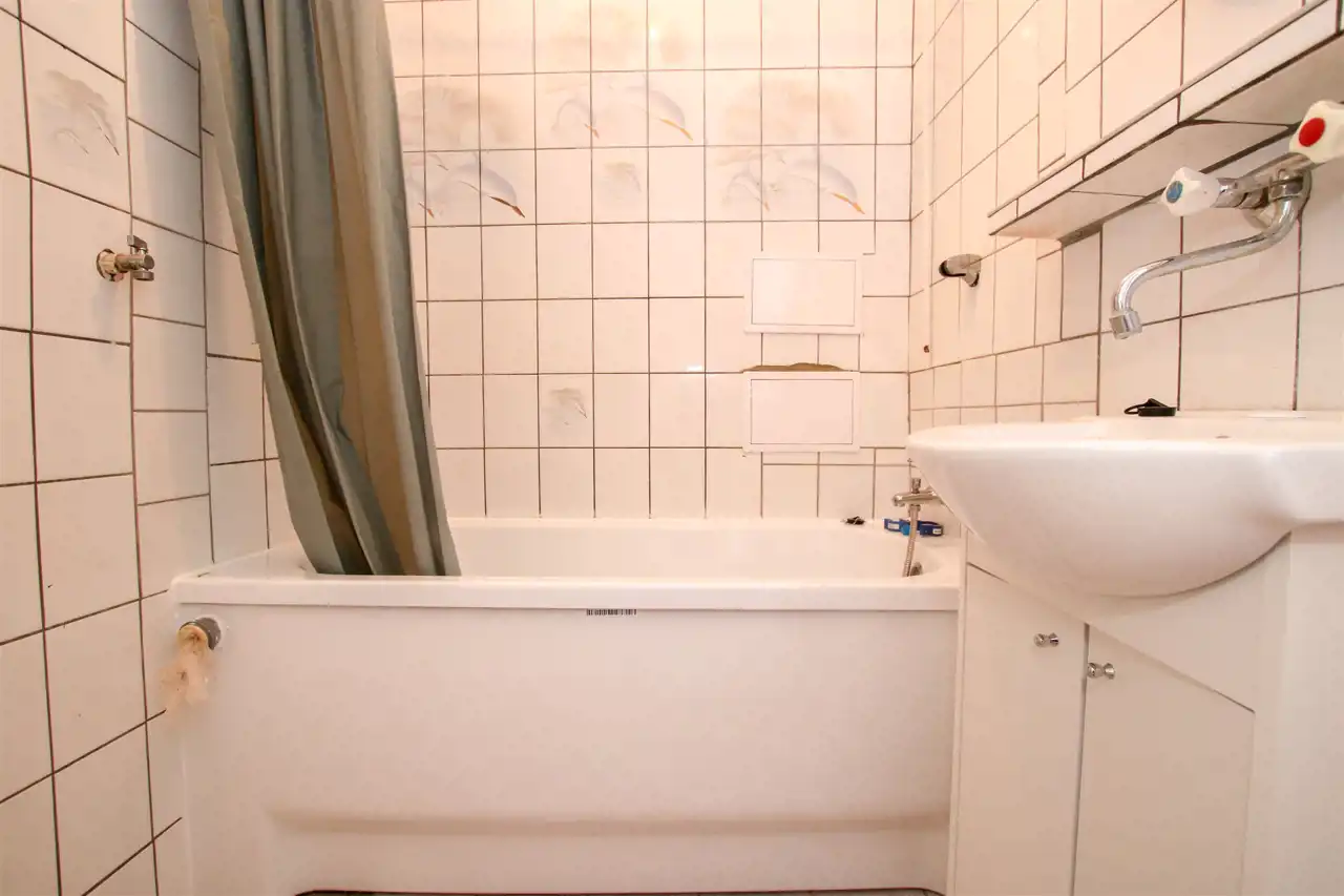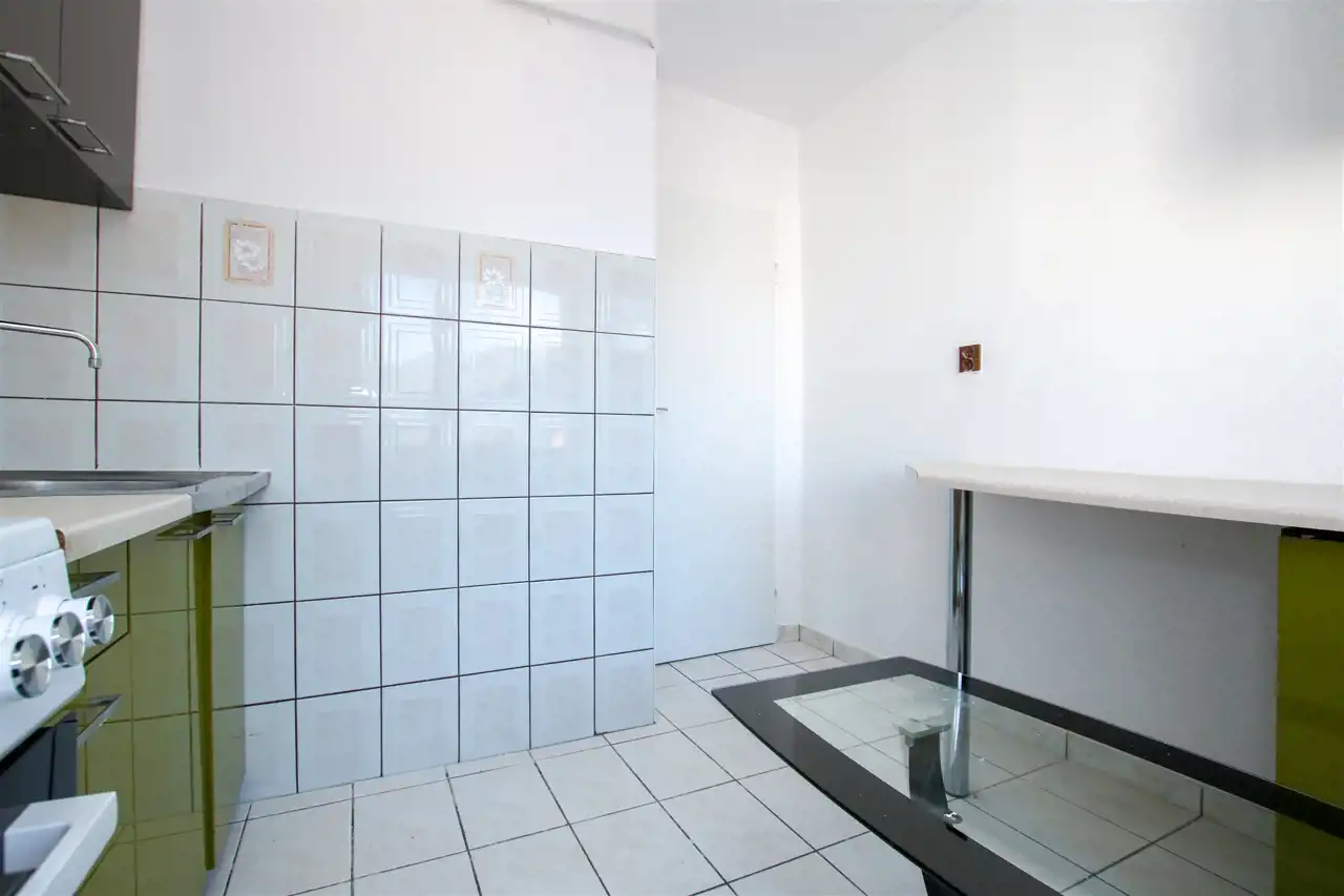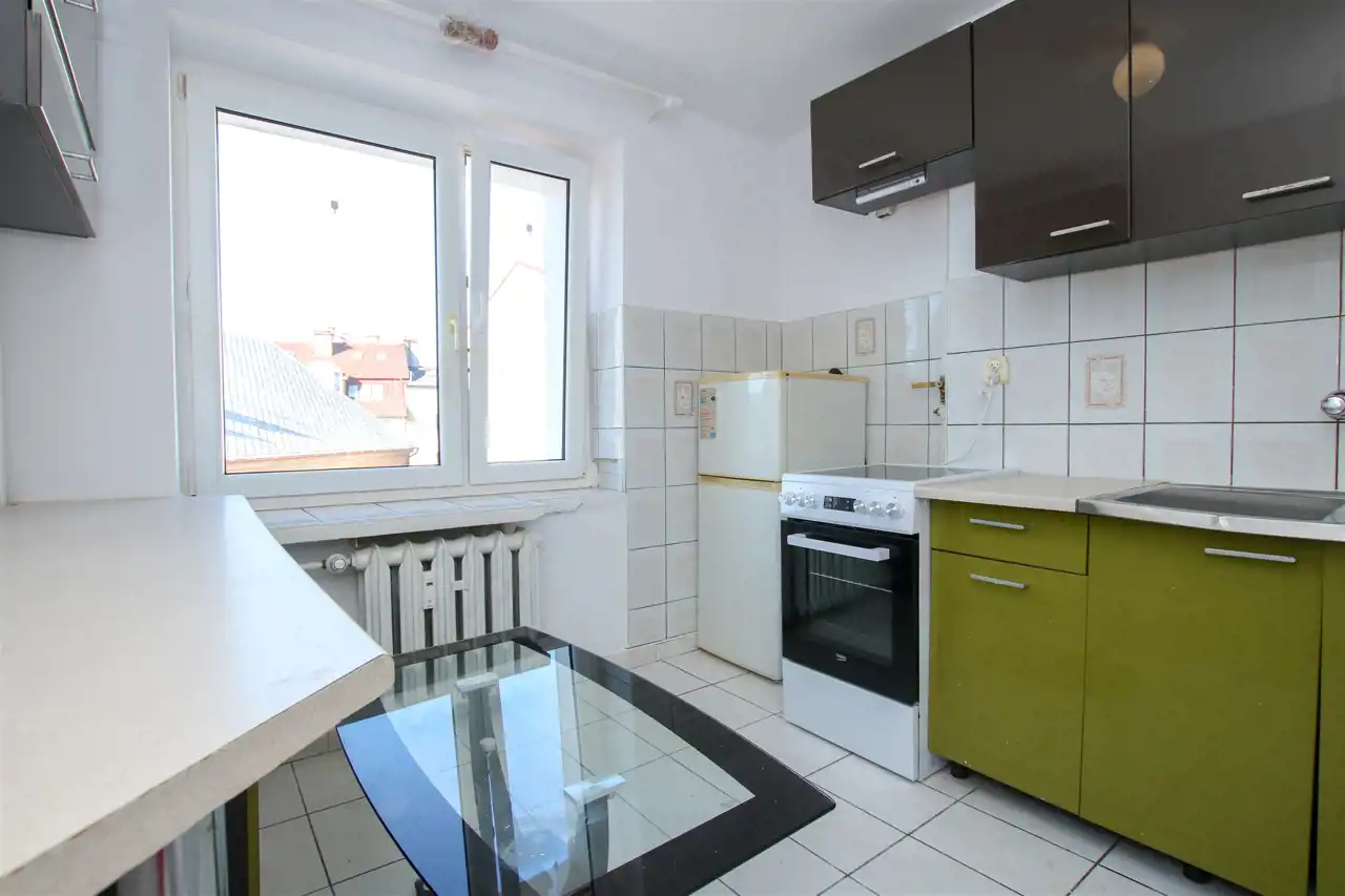 Oddzielna kuchnia została w pełni wyposażona w niezbędne sprzęty AGD, w tym piekarnik, lodówko-zamrażarkę czy płytę elektryczną. Dodatkowym atutem jest praktyczny blat do przygotowywania posiłków. Łazienka z wanną i pralką oraz osobna toaleta została wykończona w jasnych kolorach.