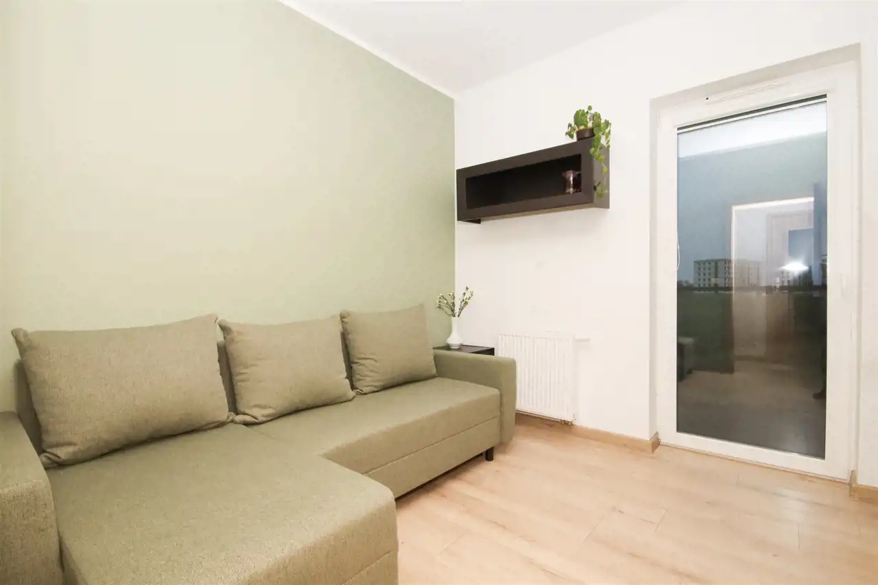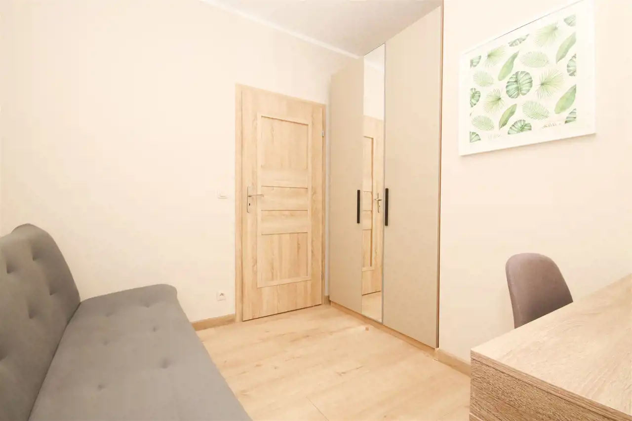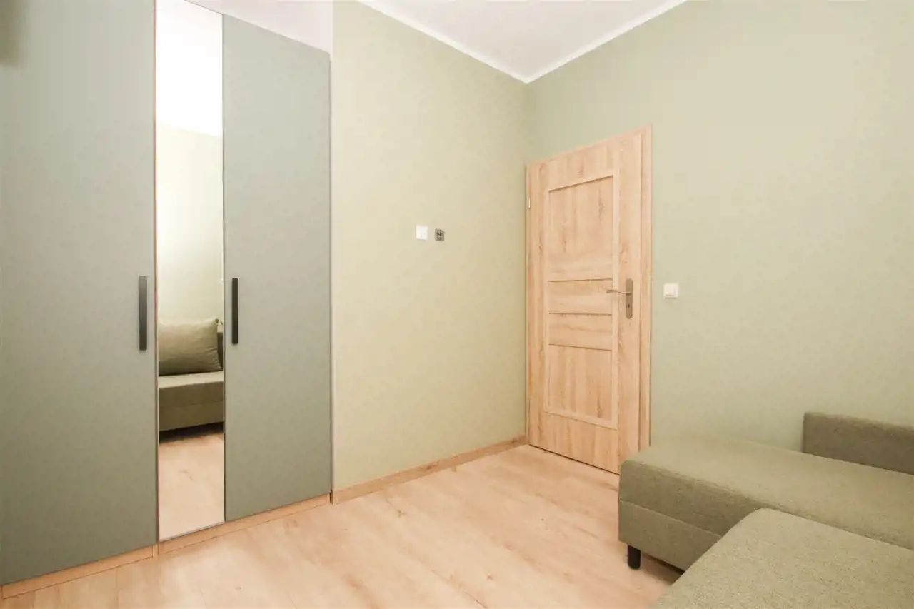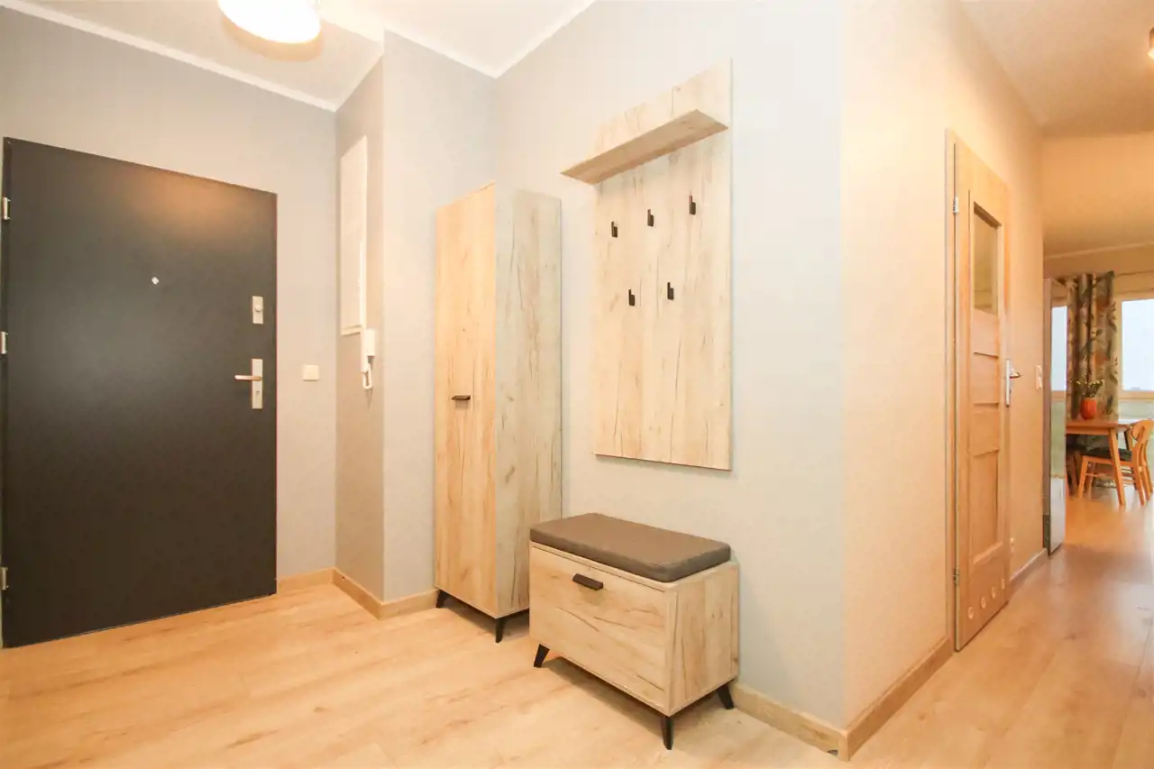 W skład mieszkania wchodzą: Salon z aneksem kuchennym - przestronny i jasny, wyposażony w kanapę, szafkę RTV oraz stół z czterema krzesłami. Aneks kuchenny w pełni umeblowany i wyposażony w niezbędny sprzęt AGD. Sypialnia główna - z rogówką oraz pojemną szafą, zapewniającą dużo miejsca do przechowywania. Drugi pokój - idealny na biuro, pokój dziecka lub gościnny. Przedpokój - z praktycznym miejscem do przechowywania. Balkon - z widokiem na zielone otoczenie osiedla, doskonały na poranną kawę lub wieczorny relaks. Całość urządzona z dbałością o funkcjonalność, wygodę i estetykę.