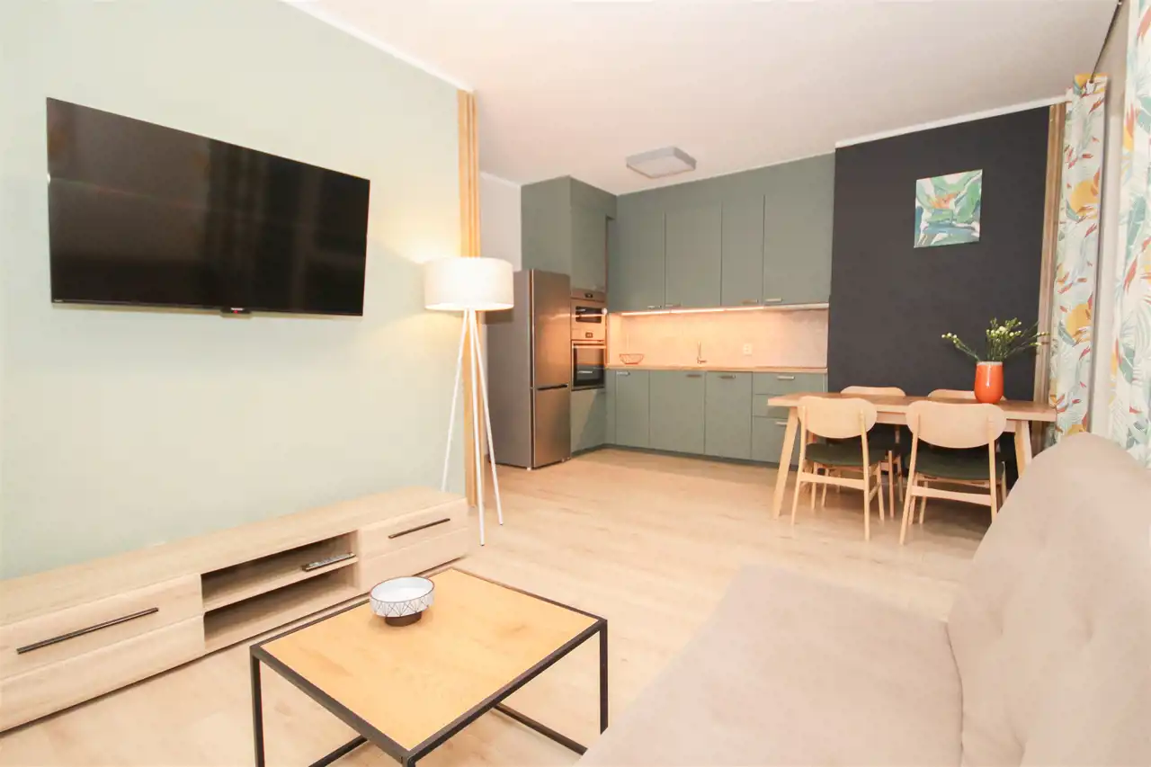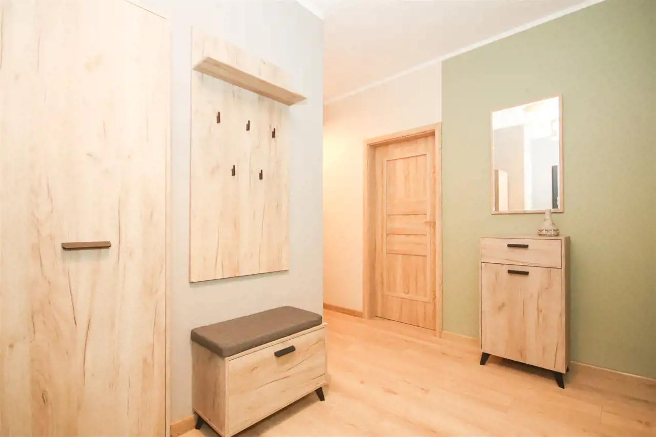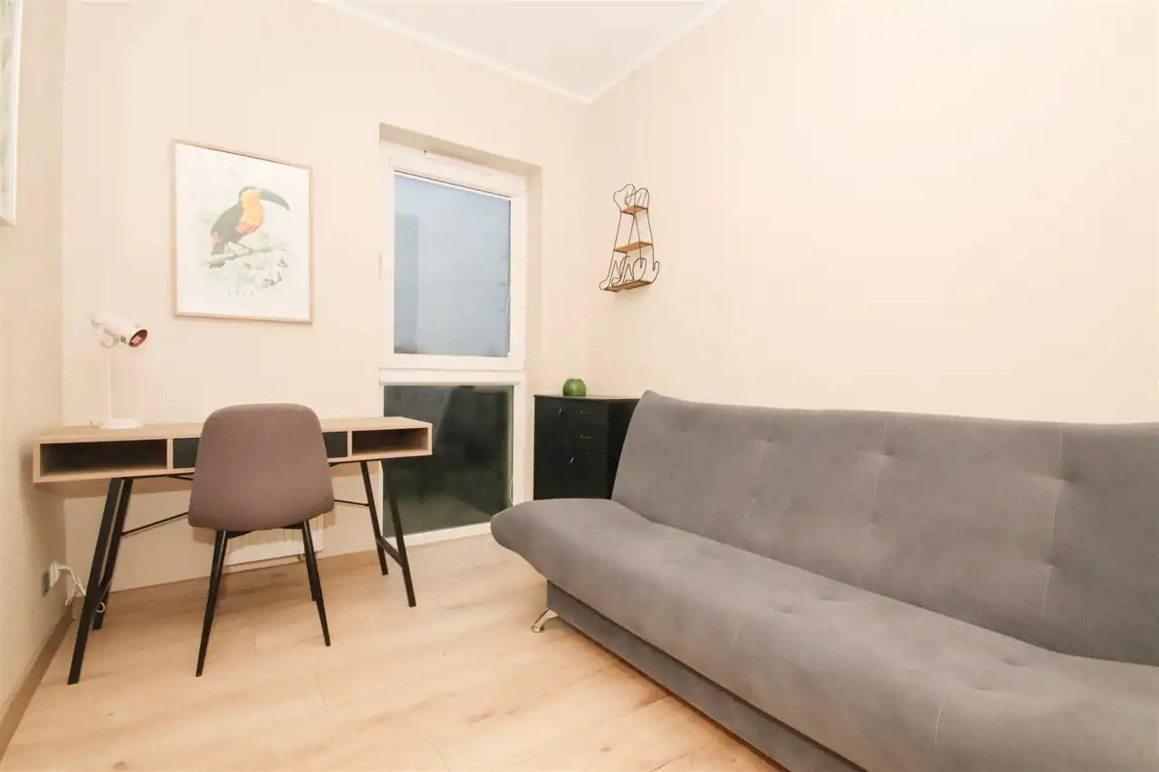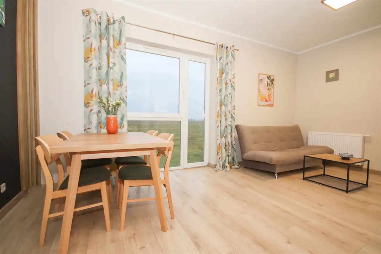 W skład mieszkania wchodzą: Salon z aneksem kuchennym - przestronny i jasny, wyposażony w kanapę, szafkę RTV oraz stół z czterema krzesłami. Aneks kuchenny w pełni umeblowany i wyposażony w niezbędny sprzęt AGD. Sypialnia główna - z rogówką oraz pojemną szafą, zapewniającą dużo miejsca do przechowywania. Drugi pokój - idealny na biuro, pokój dziecka lub gościnny. Przedpokój - z praktycznym miejscem do przechowywania. Balkon - z widokiem na zielone otoczenie osiedla, doskonały na poranną kawę lub wieczorny relaks. Całość urządzona z dbałością o funkcjonalność, wygodę i estetykę.
