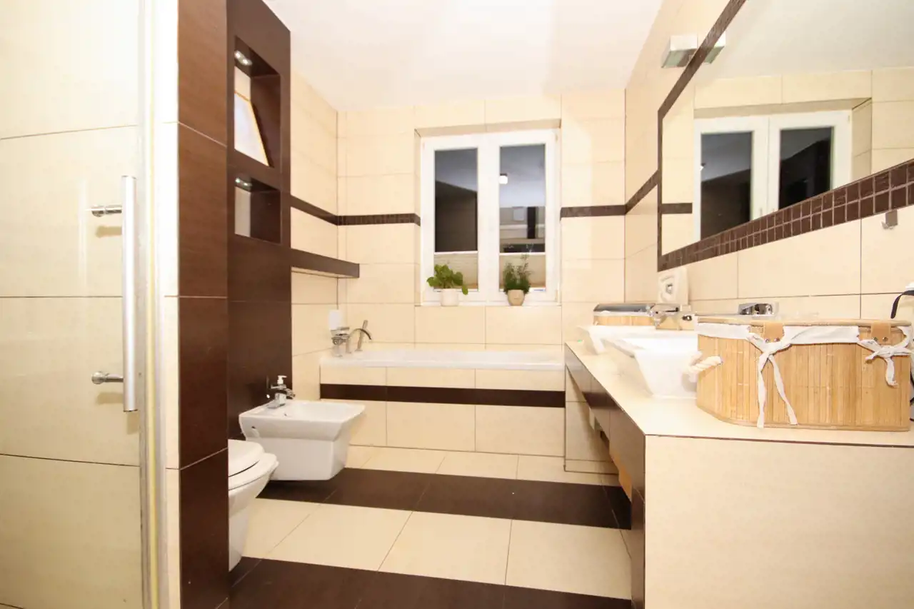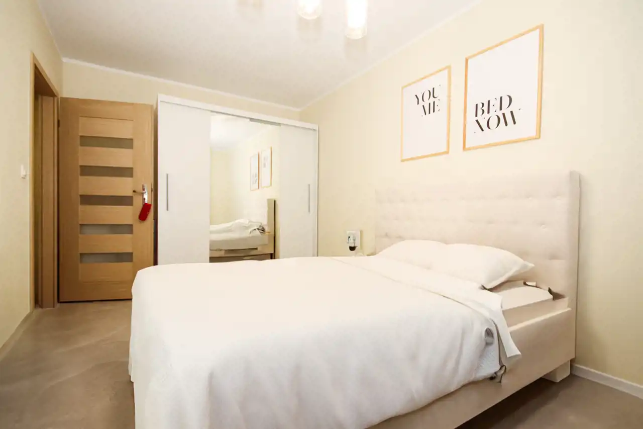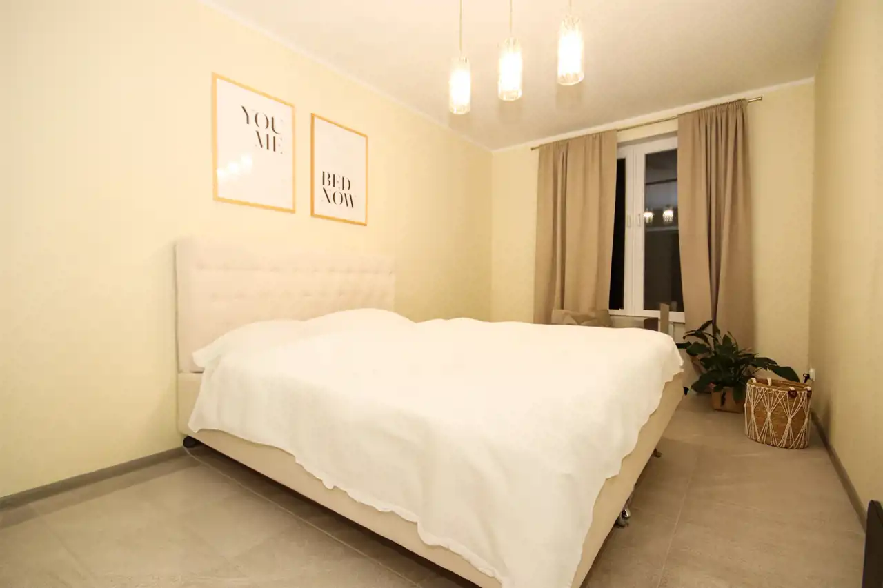 Zapraszamy do zapoznania się z ofertą wynajmu nowoczesnego, przestronnego mieszkania o powierzchni 75m², położonego na 2. piętrze w eleganckim budynku. Mieszkanie jest ogrzewane z sieci miejskiej, a jego nowoczesny wystrój oraz wysoki standard wykończenia gwarantują komfort i wygodę. Mieszkanie składa się z przestronnego salonu połączonego z aneksem kuchennym. W części wypoczynkowej salonu znajduje się duża, wygodna kanapa ustawiona naprzeciw telewizora, co sprawia, że jest to idealne miejsce do relaksu. Kuchnia jest w pełni wyposażona w nowoczesny sprzęt AGD, w tym lodówkę, zmywarkę, płytę indukcyjną, okap oraz zlew z młynkiem. Dodatkowym atutem kuchni jest barek z hokerami, który doskonale sprawdzi się zarówno podczas posiłków, jak i spotkań towarzyskich. W części kuchennej zamontowano ogrzewanie podłogowe, co zwiększa komfort użytkowania. W mieszkaniu znajdują się dwie sypialnie. Jedna z nich, z łóżkiem, komodą oraz szafą w zabudowie, Druga sypialnia to miejsce do zagospodarowania we własnym zakresie. To przestrzenie idealne zarówno do odpoczynku, jak i pracy. W mieszkaniu dostępne są także dwie łazienki. Pierwsza, pełniąca funkcję pokoju kąpielowego, została wyposażona w dużą wannę, osobny prysznic oraz elegancką armaturę, co czyni ją idealnym miejscem do relaksu. Druga łazienka zawiera WC, umywalkę oraz pralkę, co jest bardzo praktycznym rozwiązaniem. W mieszkaniu garderoba stanowi osobne pomieszczenie, które zostało zaprojektowane z myślą o przechowywaniu odzieży, obuwia i innych akcesoriów. Dzięki temu rozwiązaniu, mieszkańcy zyskują dodatkową przestrzeń, która pozwala na utrzymanie porządku w sypialni oraz innych częściach mieszkania. W przedpokoju znajduje się pojemna szafa w zabudowie, która zapewnia wygodne miejsce do przechowywania odzieży i innych rzeczy.