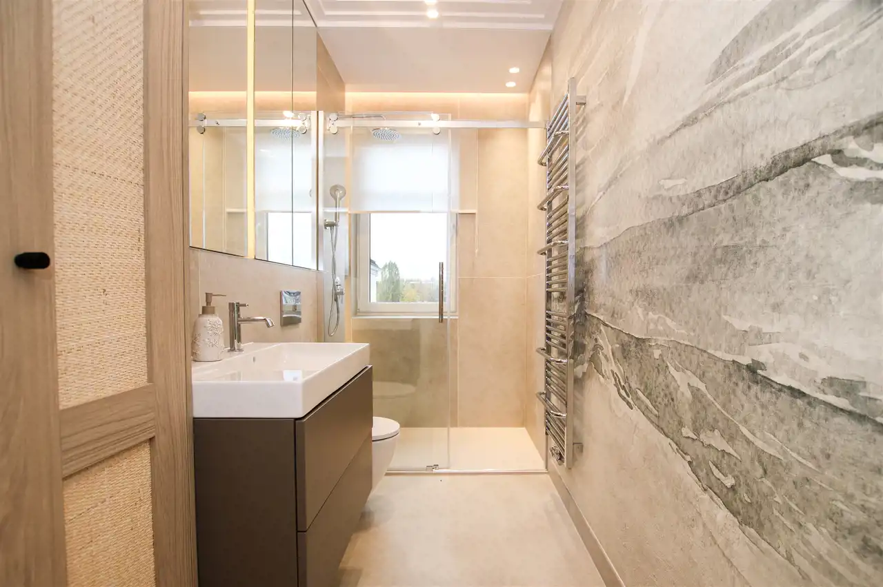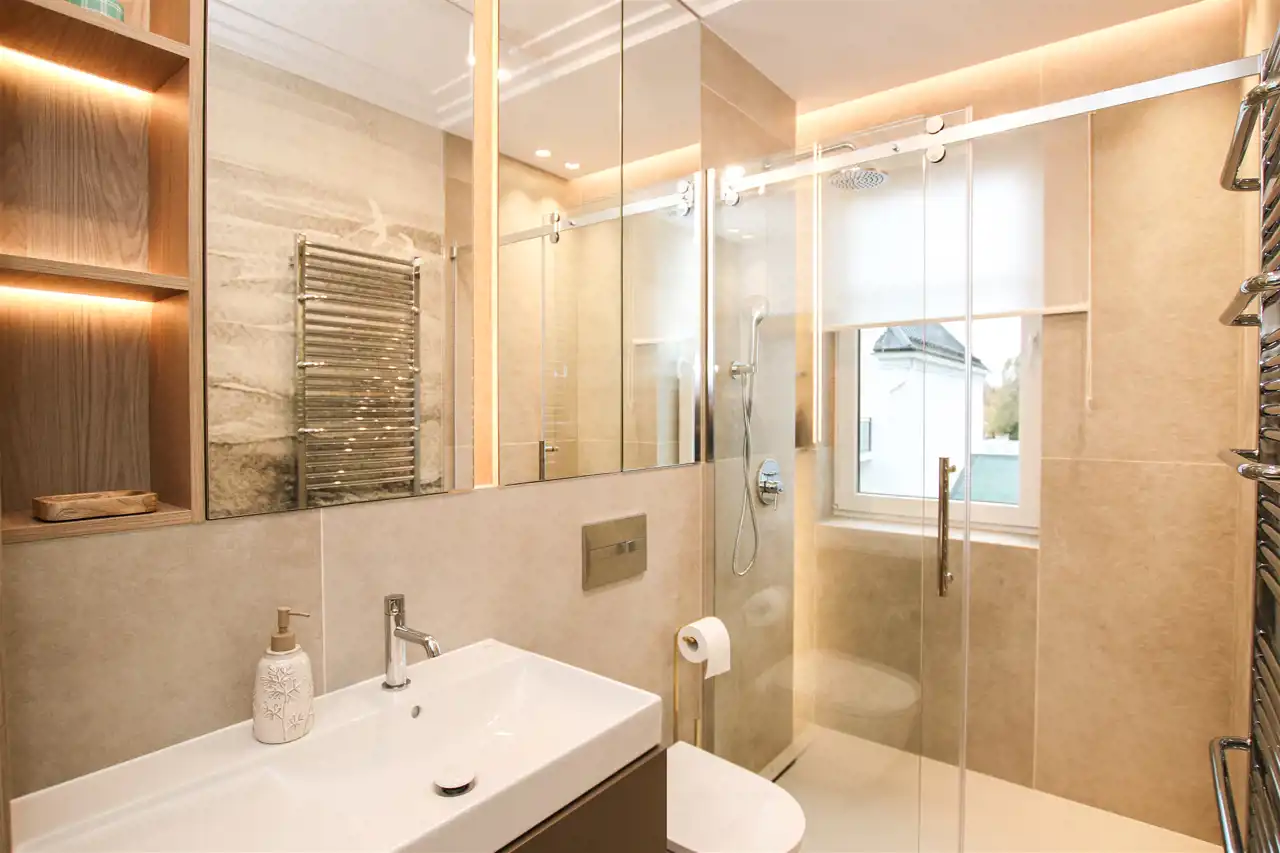 - Łazienka z WC stylowo wykończona glazurą i terakotą, wyposażona w prysznic, umywalkę z zabudową oraz pralkę.