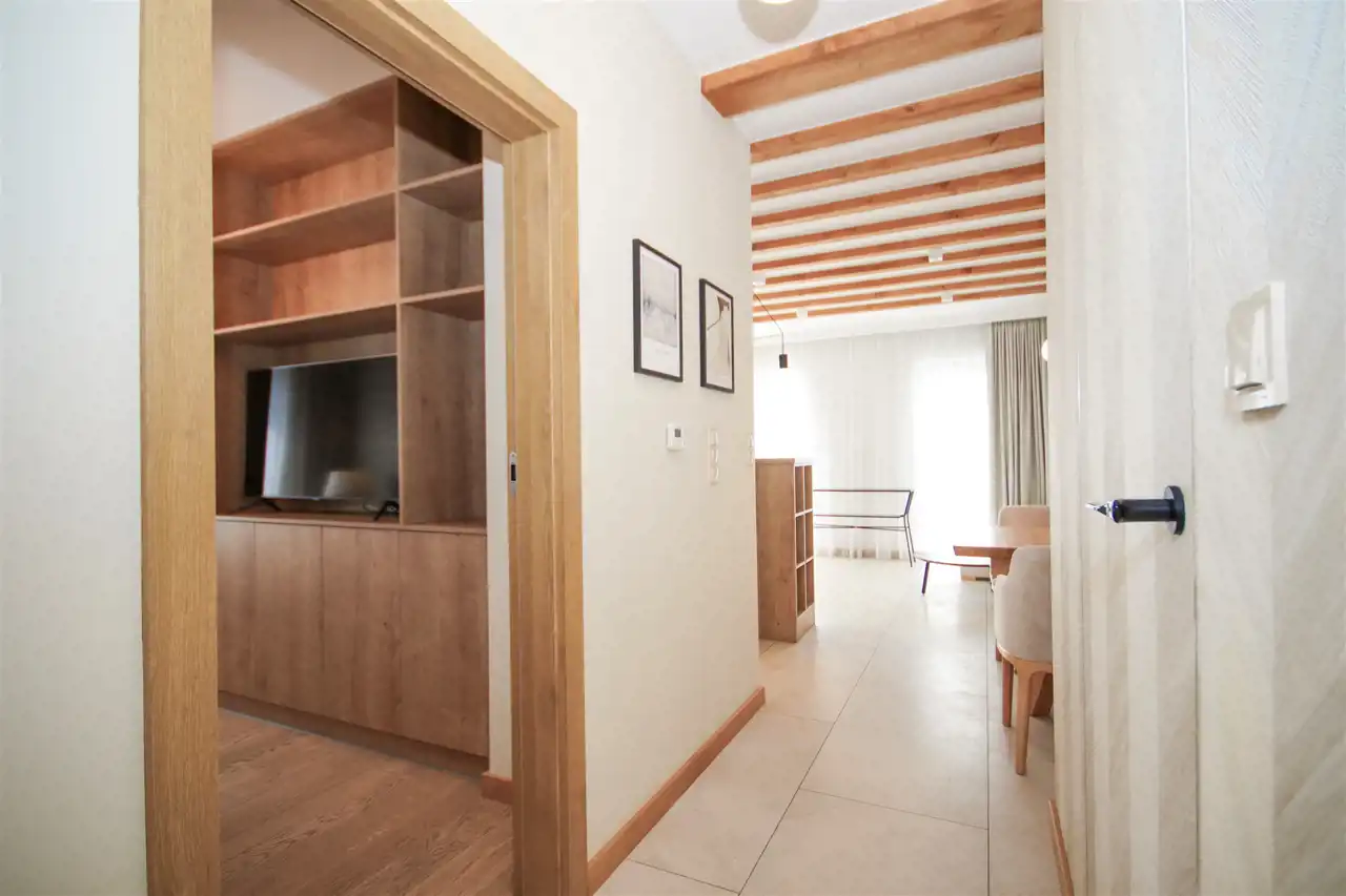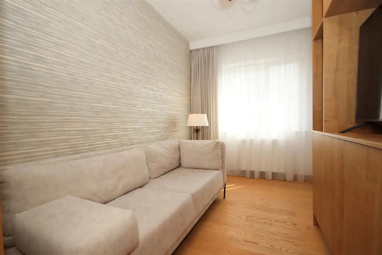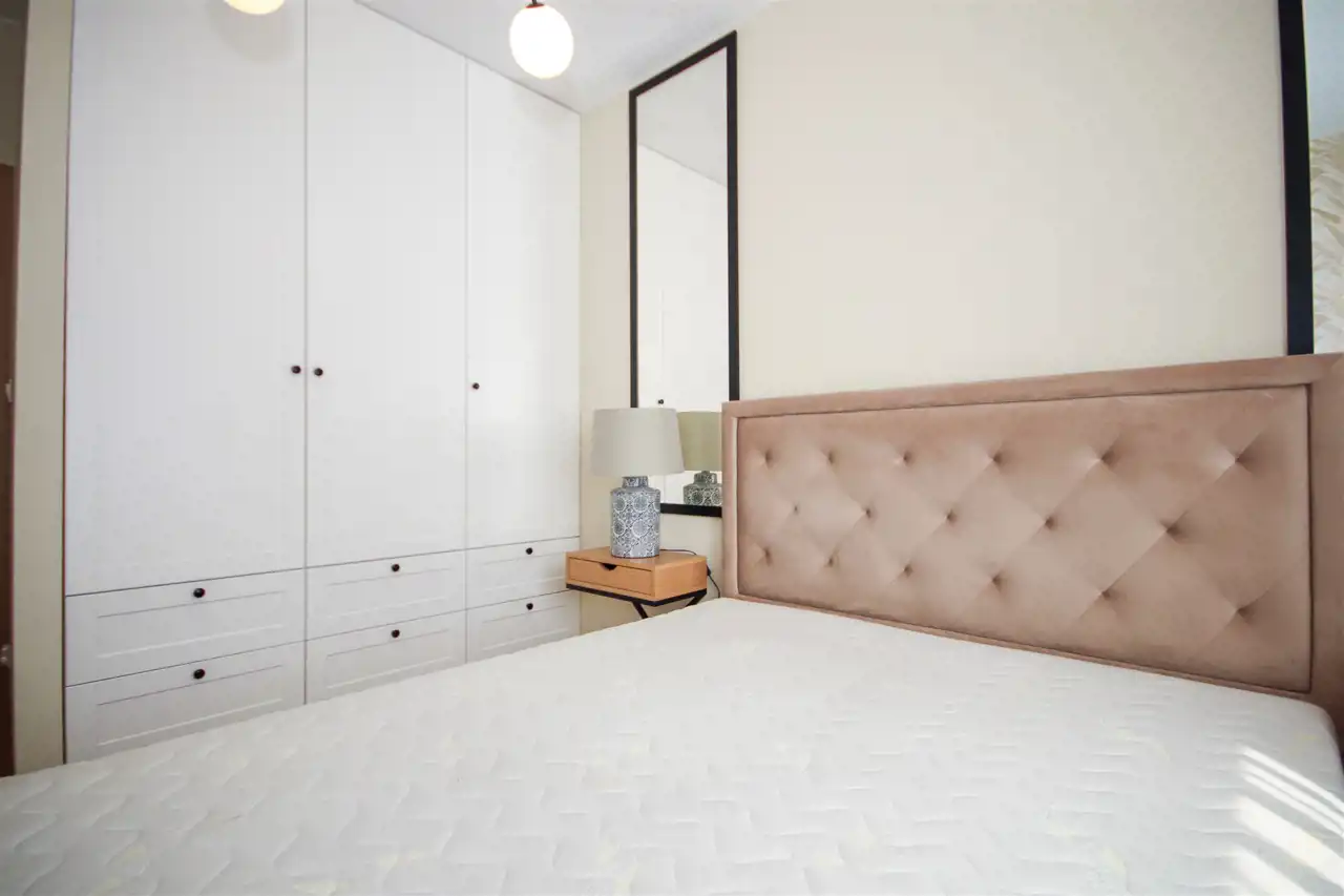 Sypialnia została wyposażona w komfortowe, przestronne łóżko, stylowe szafki nocne oraz pojemną szafę, która pomieści wszystkie rzeczy. Dodatkowy pokój stanowi idealne miejsce do pracy lub przyjmowania gości, z rozkładaną sofą, funkcjonalnymi meblami do przechowywania oraz telewizorem, który zapewni rozrywkę.