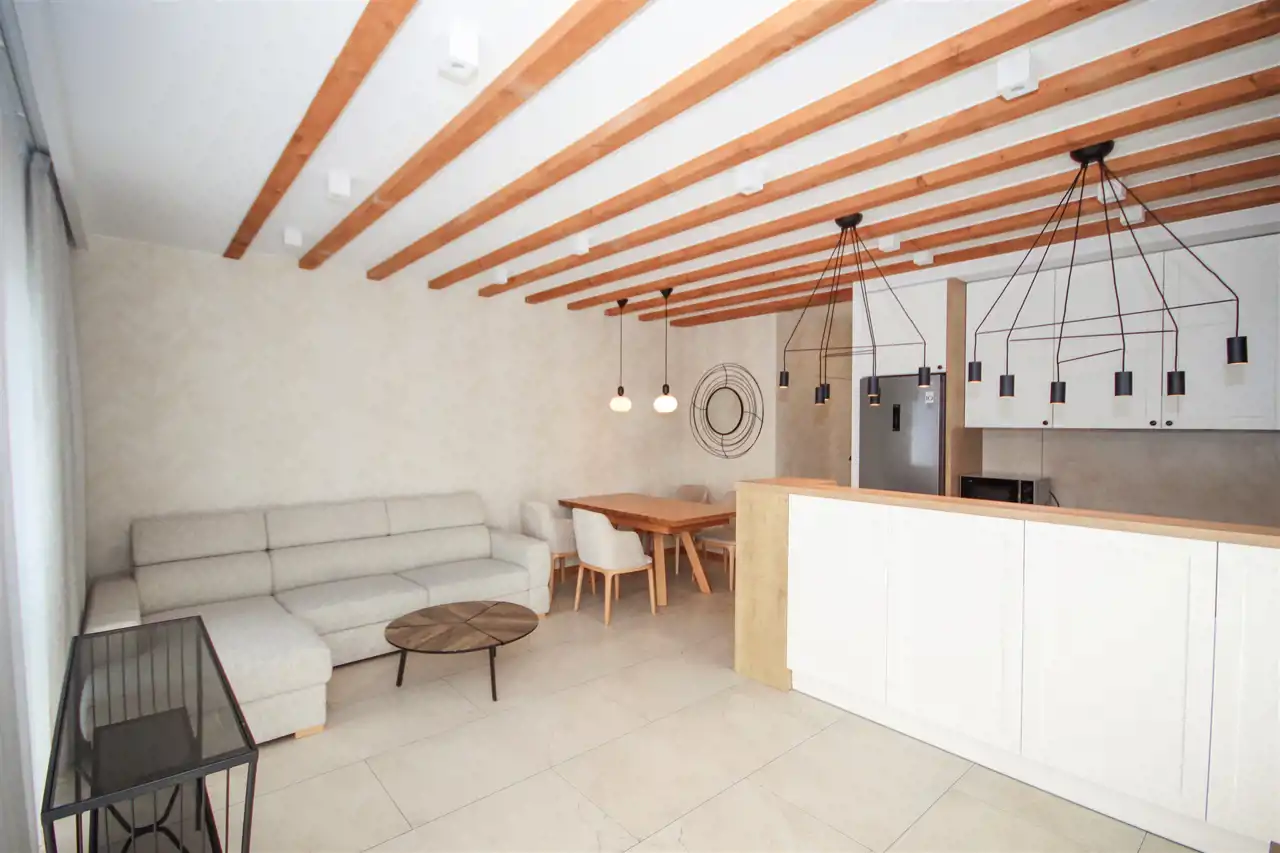 To wyjątkowe mieszkanie, w którym przestrzeń salonu z aneksem kuchennym została harmonijnie zaaranżowana, tworząc otwartą i funkcjonalną strefę, idealną do codziennego życia oraz relaksu. Przestronny salon płynnie łączy się z nowoczesną kuchnią, która zachwyca elegancką zabudową oraz wysokiej klasy sprzętem AGD, w tym lodówką, kuchenką, płytą elektryczną, pochłaniaczem i zmywarką. W strefie wypoczynkowej salonu czeka wygodny narożnik, doskonale dobrane meble RTV, stylowy stolik kawowy, a także duży telewizor. Dodatkowo, przy salonie znajduje się przestrzeń jadalniana z dużym stołem i wygodnymi krzesłami, gdzie wspólne posiłki będą prawdziwą przyjemnością. Całość oświetlają duże okna, które prowadzą na przestronny, malowniczy taras – idealne miejsce do relaksu na świeżym powietrzu.