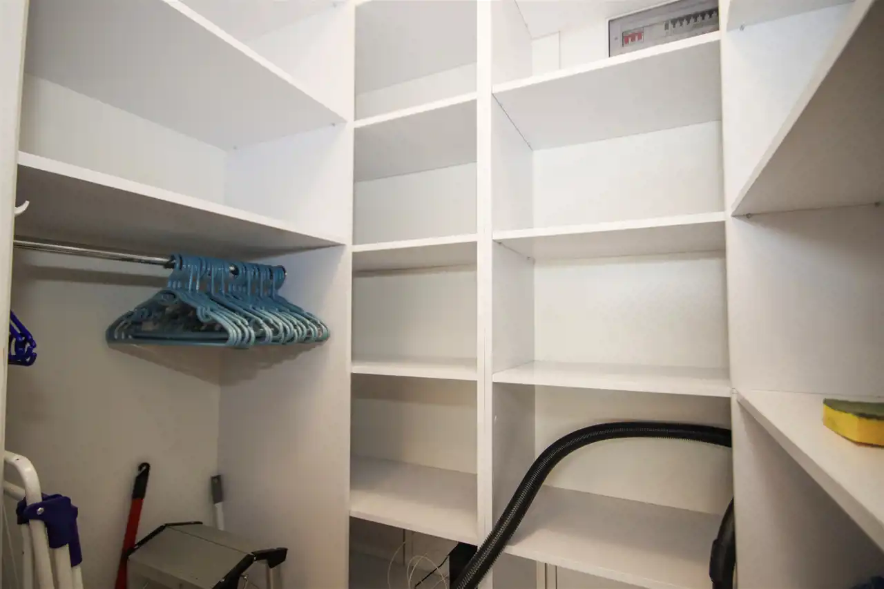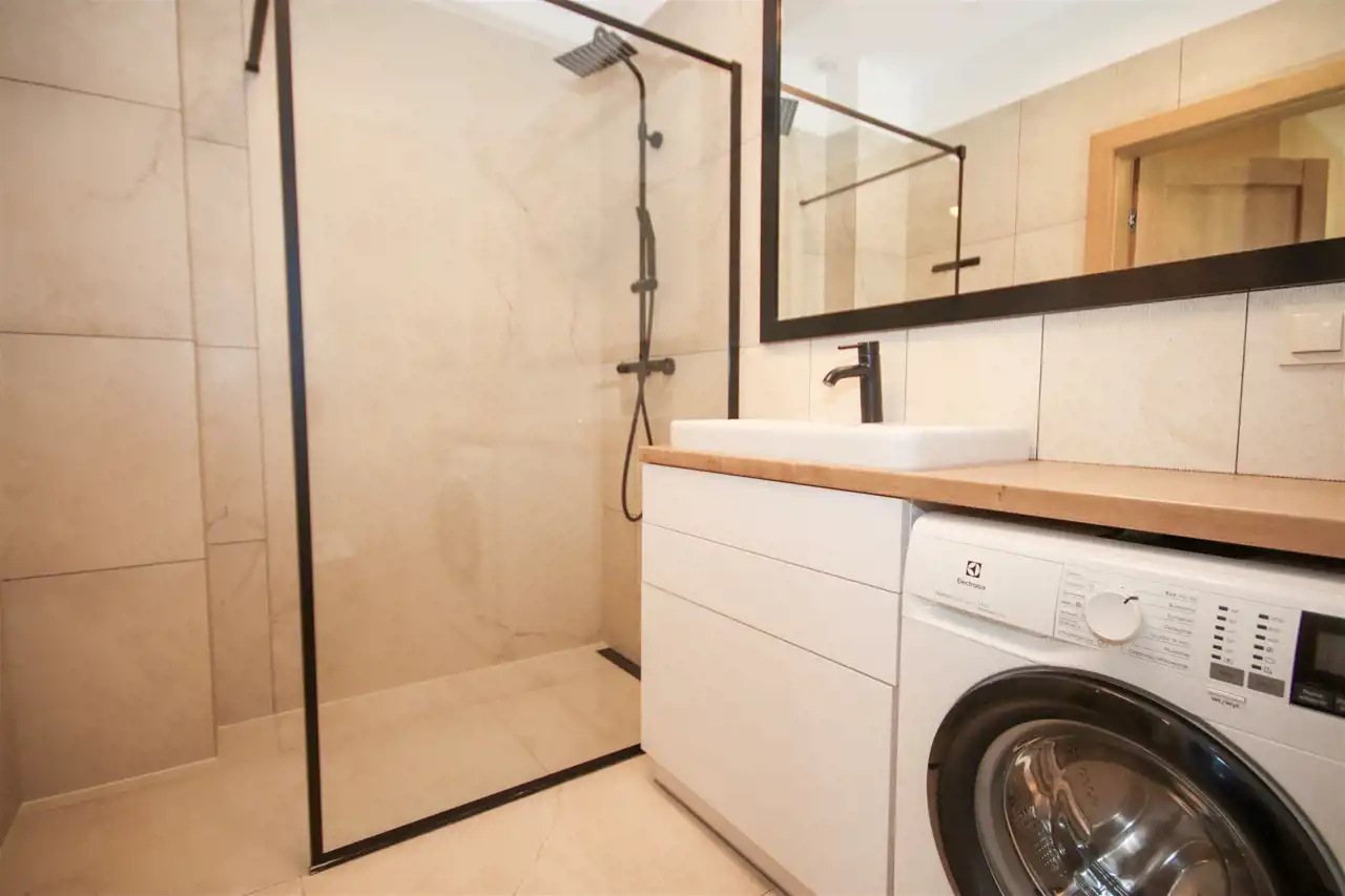 Łazienka, wykończona elegancką glazurą i terakotą, oferuje komfortową przestrzeń wyposażoną w umywalkę, toaletę, pralkę oraz nowoczesny prysznic typu walk-in, który zapewnia wygodę i komfort codziennego użytkowania. Praktyczne pomieszczenie gospodarcze z pełną zabudową stanowi doskonałe miejsce do przechowywania, oferując dodatkową przestrzeń na niezbędne rzeczy.