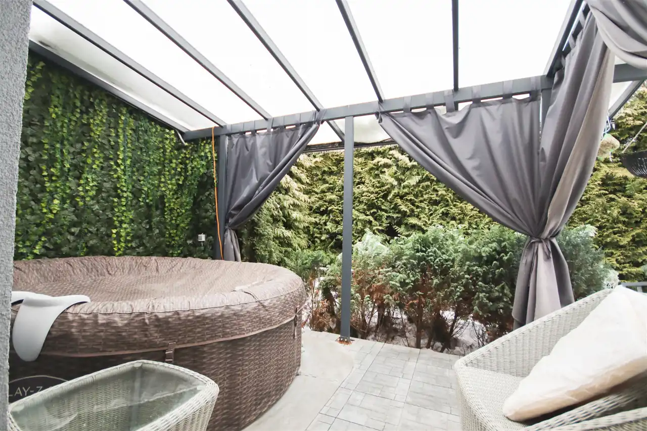 Na tarasie znajduje się antresola, stanowiąca dodatkową przestrzeń wypoczynkową.