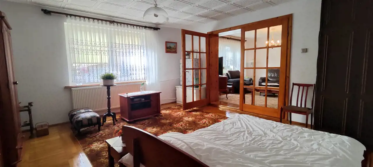 - duży salon z drzwiami dwuskrzydłowymi prowadzącymi do sypialni
