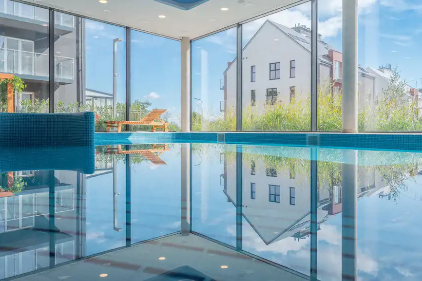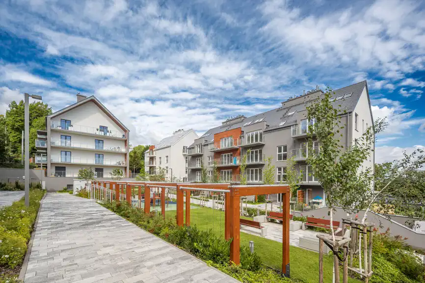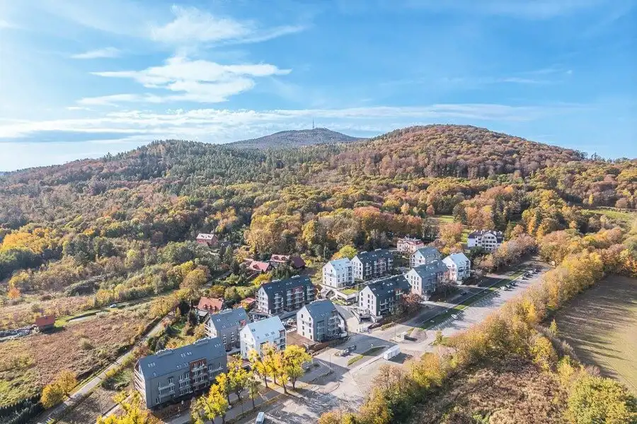 Inwestycja składa się z niewielkich, 3-piętrowych budynków mieszczących po kilkanaście mieszkań. Nowoczesne, proste bryły kryte spadzistymi dachami doskonale wpisują się w górski krajobraz. Zastosowane na elewacjach odcienie szarości przywołują na myśl wydobywany w okolicznych kamieniołomach granit, a zestawienie ich z bielą dodaje budynkom lekkości i elegancji.