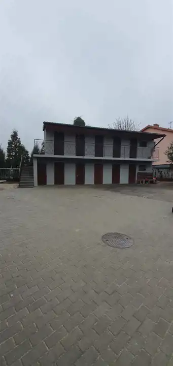 Teren wokół budynku ogrodzony i utwardzony kostką.
