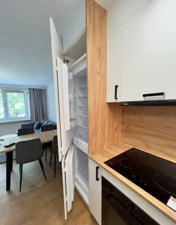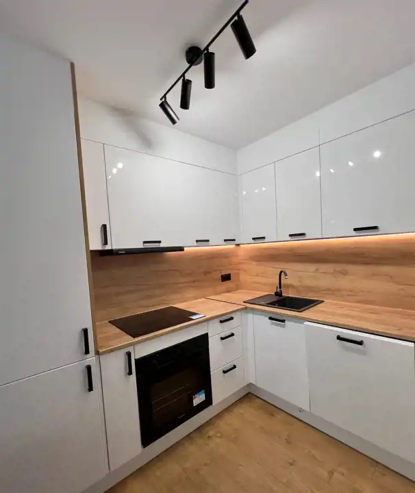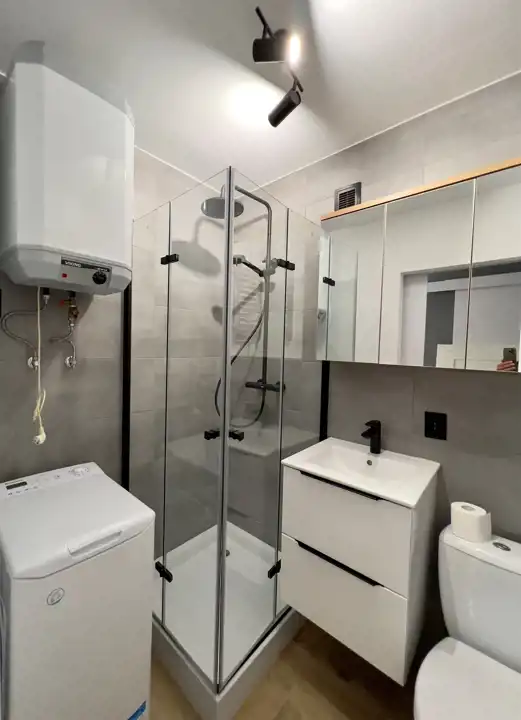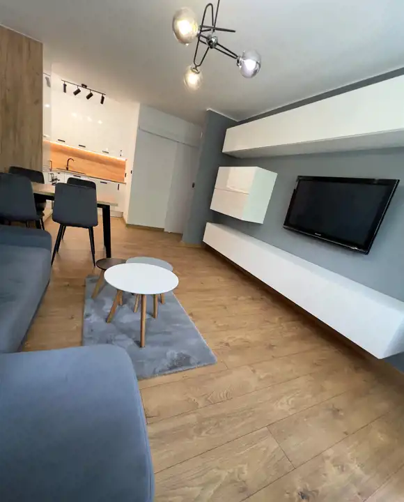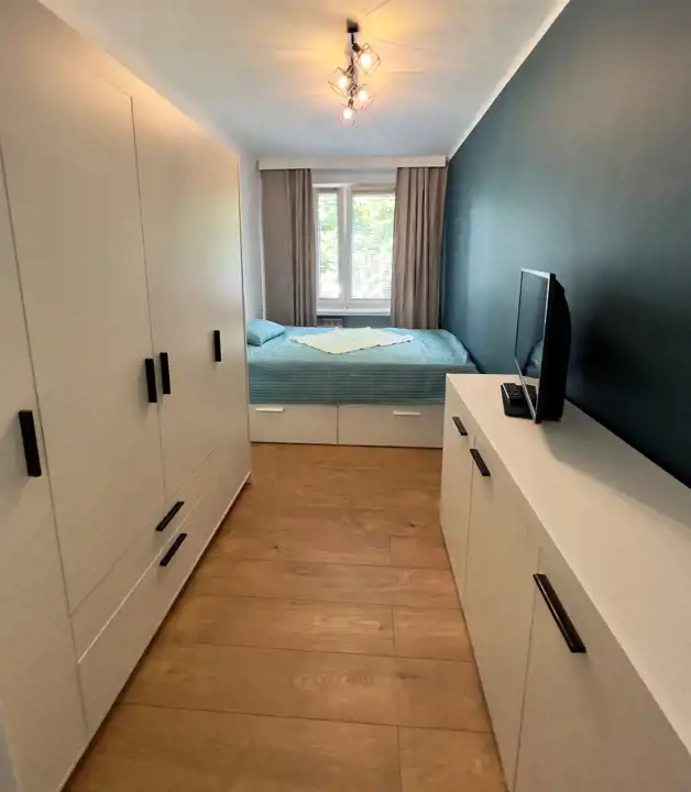 W salonie narożnik rozkładany z funkcją spania , stolik kawowy, stół z 4 krzesłami, telewizor, szafki. Kuchnia w pełni umeblowana i wyposażona w sprzęt AGD (płyta indukcyjna, piekarnik, zmywarka, lodówka, okap). W korytarzu szafa w zabudowie. W łazience pralka, szafka, umywalka, prysznic i wc. W sypialni łóżko podwójne, duża pojemna szafa oraz szafki+telewizor.