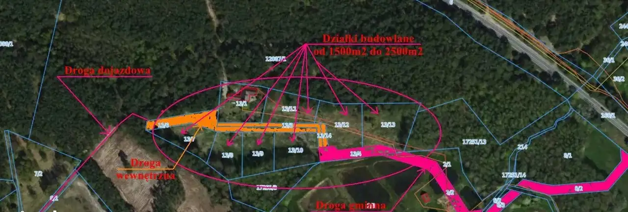 Na sprzedaż wyjątkowy teren o powierzchni ponad 14 500 m², podzielony na 7 działek budowlanych o powierzchniach od ponad 1500 m² do ponad 2200 m².