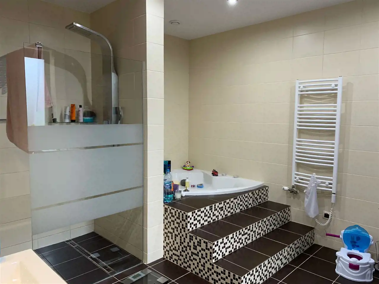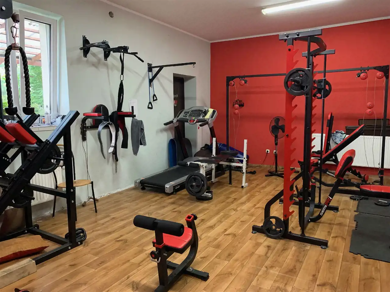 140m2 salon z jadalnią, sypialnia z garderobą, pokój dziecięcy, siłownia, duża łazienka z wanna i prysznicem.