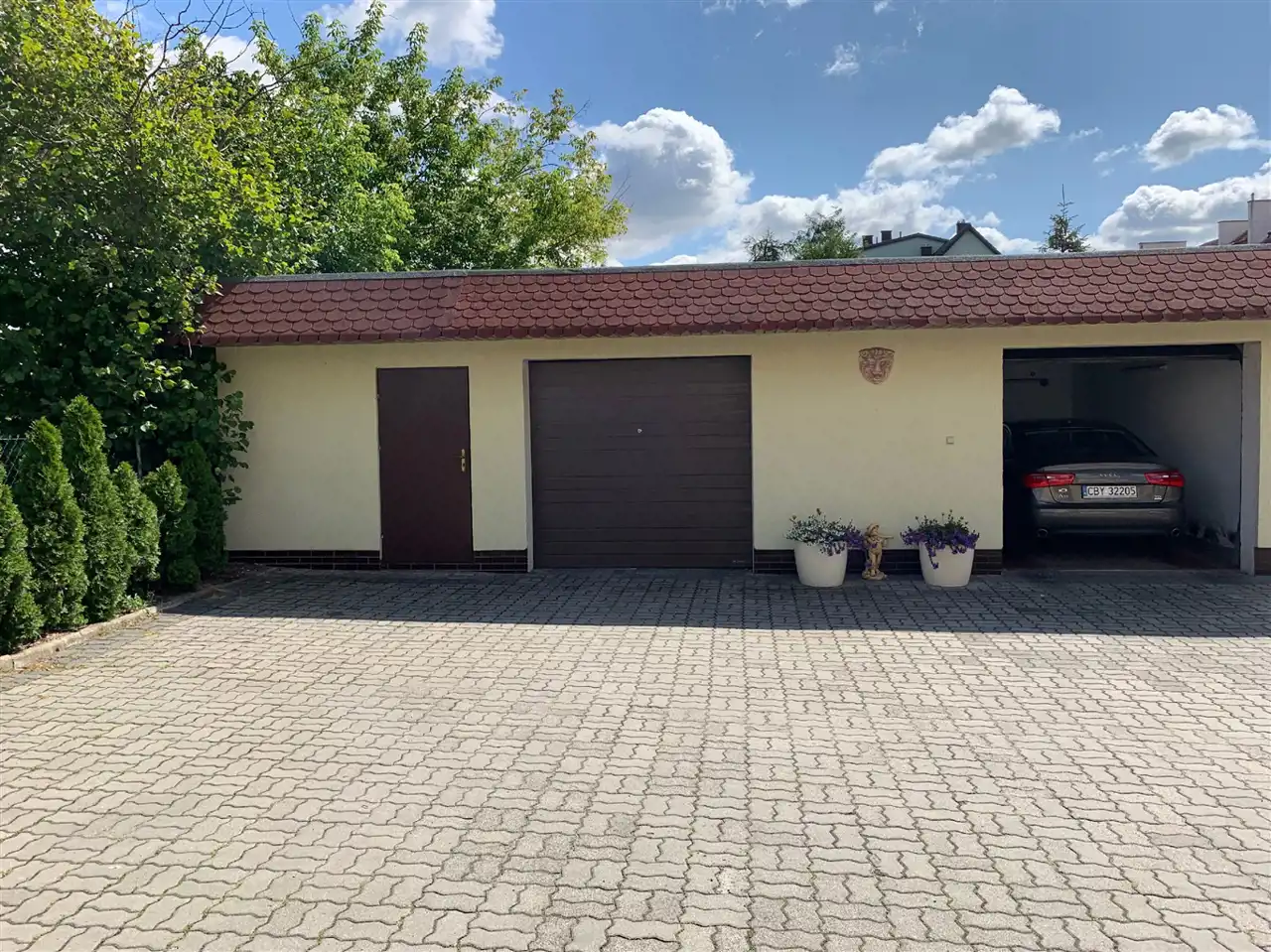 Wjazd na posesje jak i parking utwardzony kostką brukową, brama wjazdowa i bramy garażowe automatyczna.