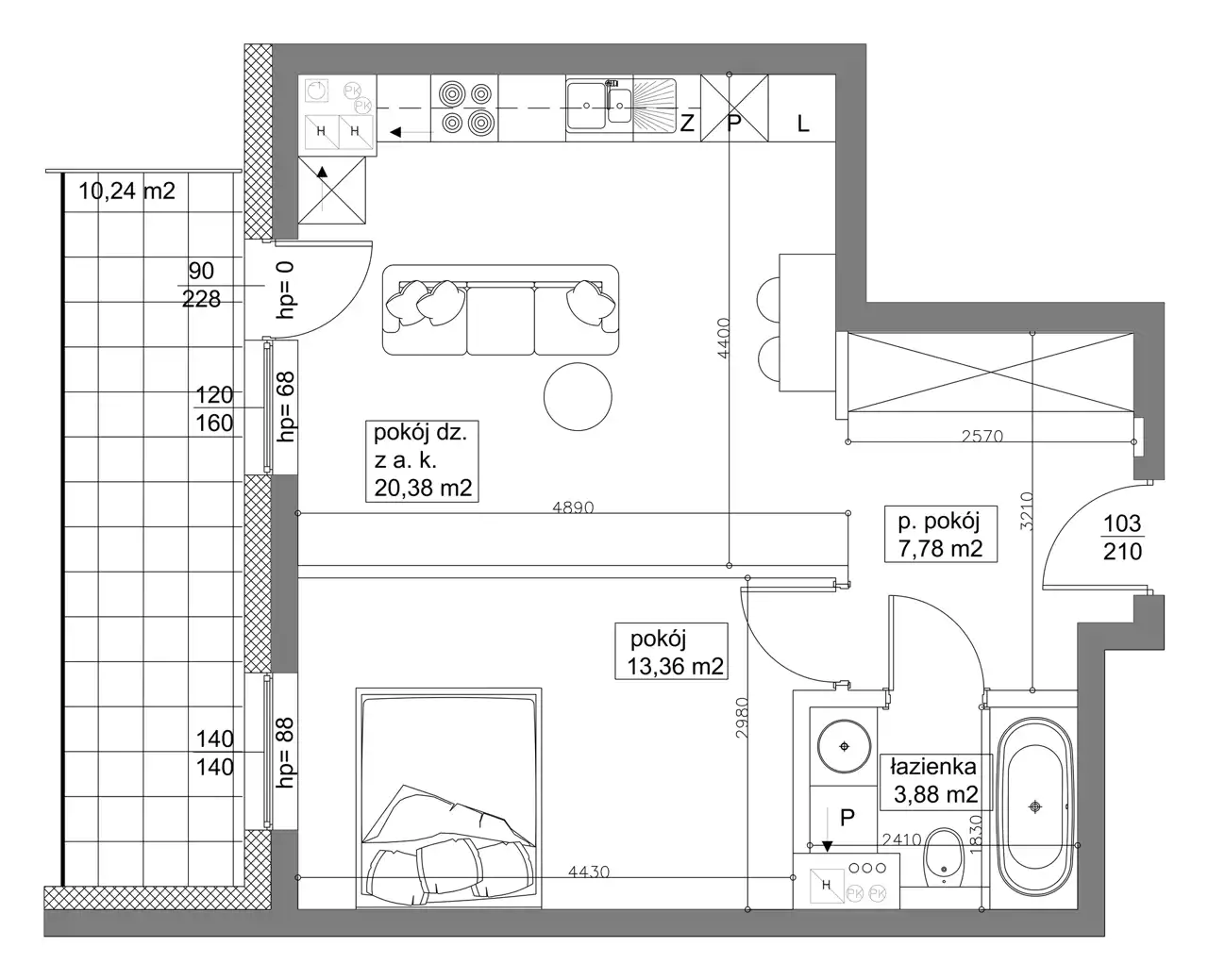 - Charakterystyka mieszkania 46.1 m2, 2 pokoje