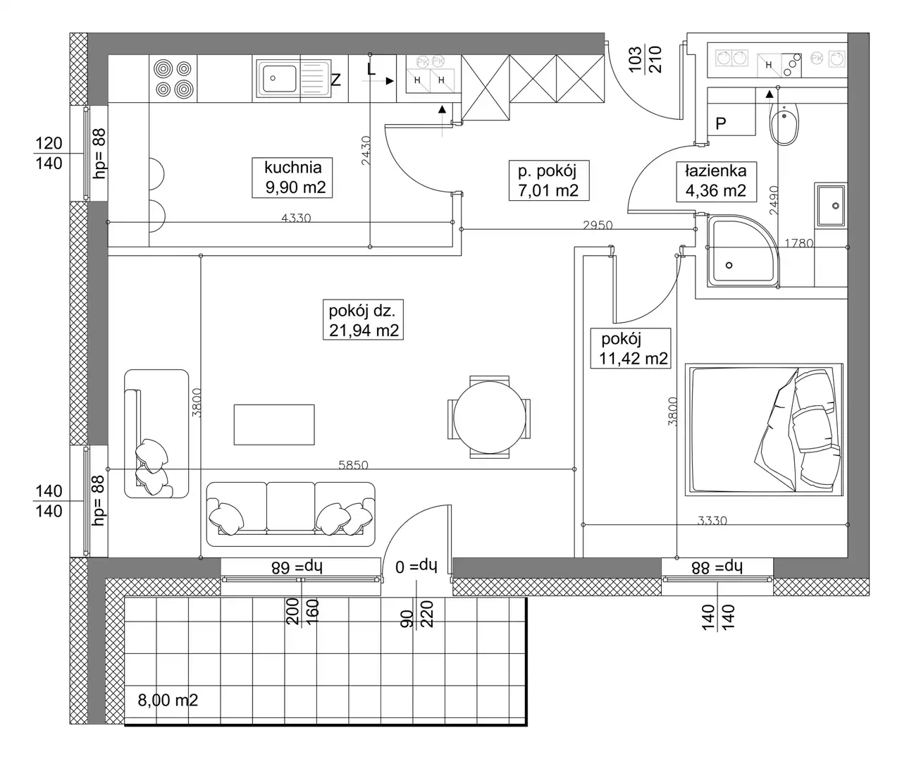 - Charakterystyka mieszkania 55.34 m2, 2 pokoje