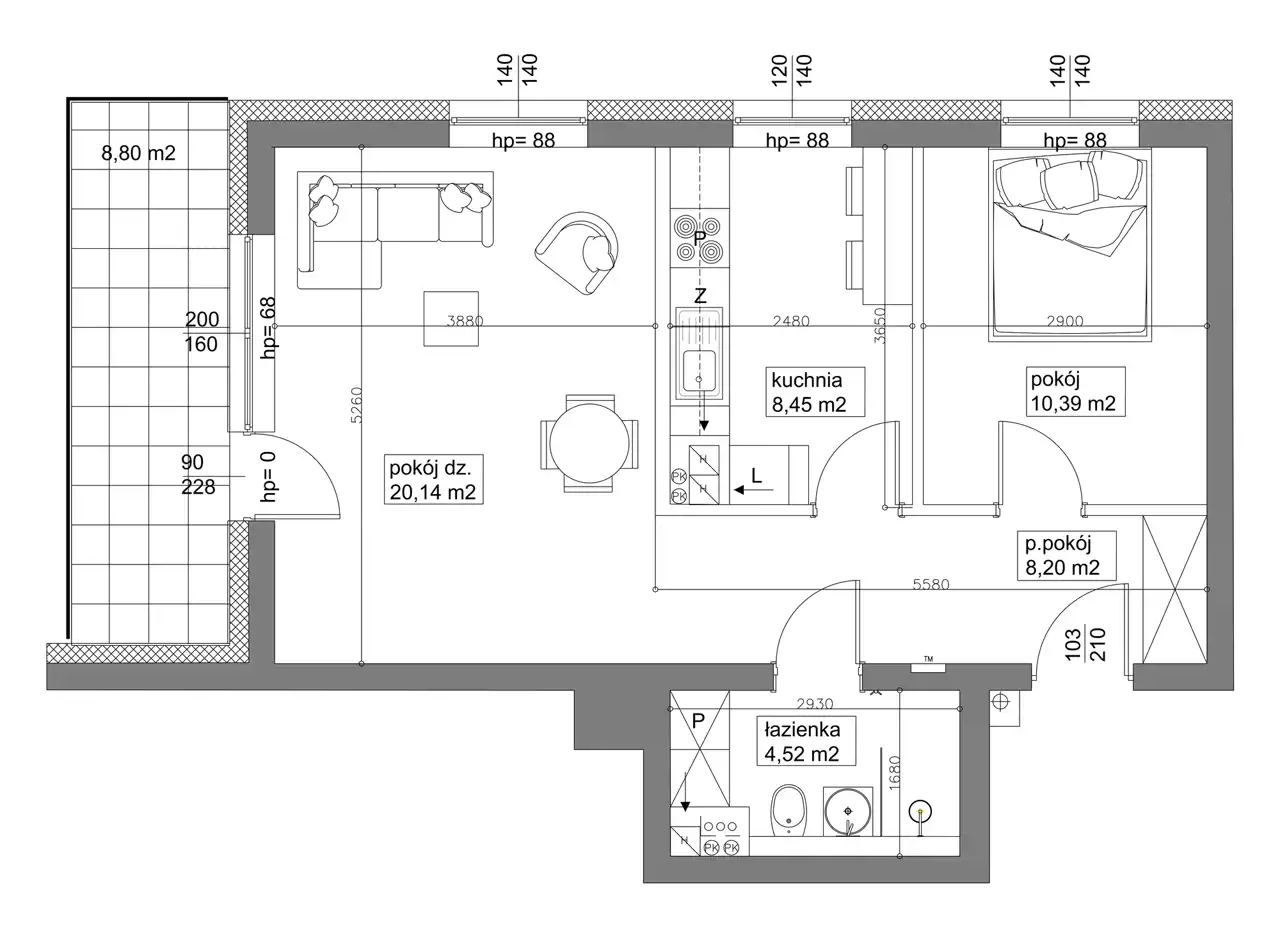 - Charakterystyka mieszkania 52.45 m2, 2 pokoje