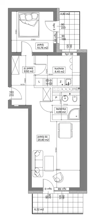 - Charakterystyka mieszkania 55.44 m2, 2 pokoje