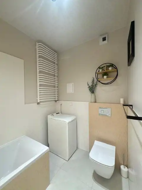 Łazienka: wanna z parawanem, podwieszane WC, umywalka nablatowa oraz szuflady, pralka