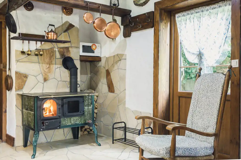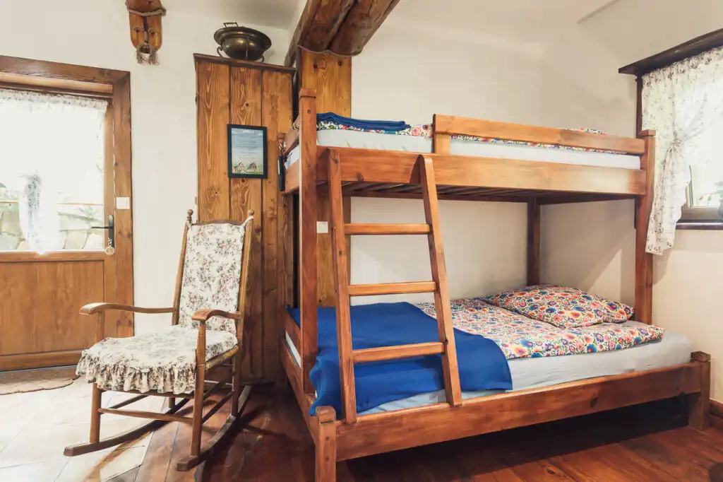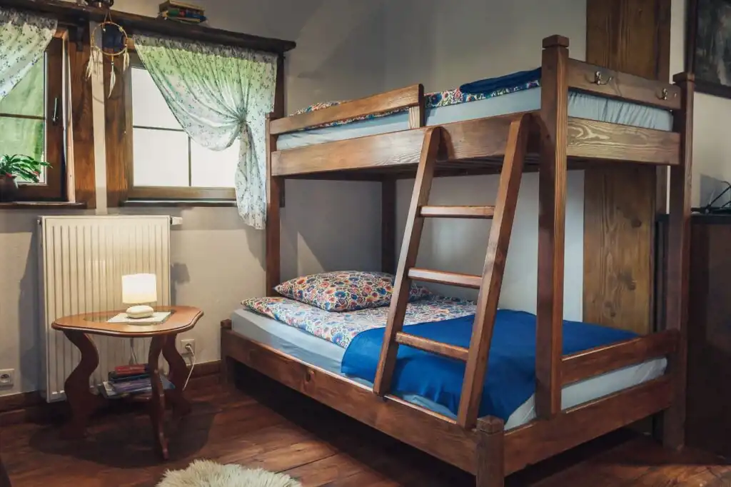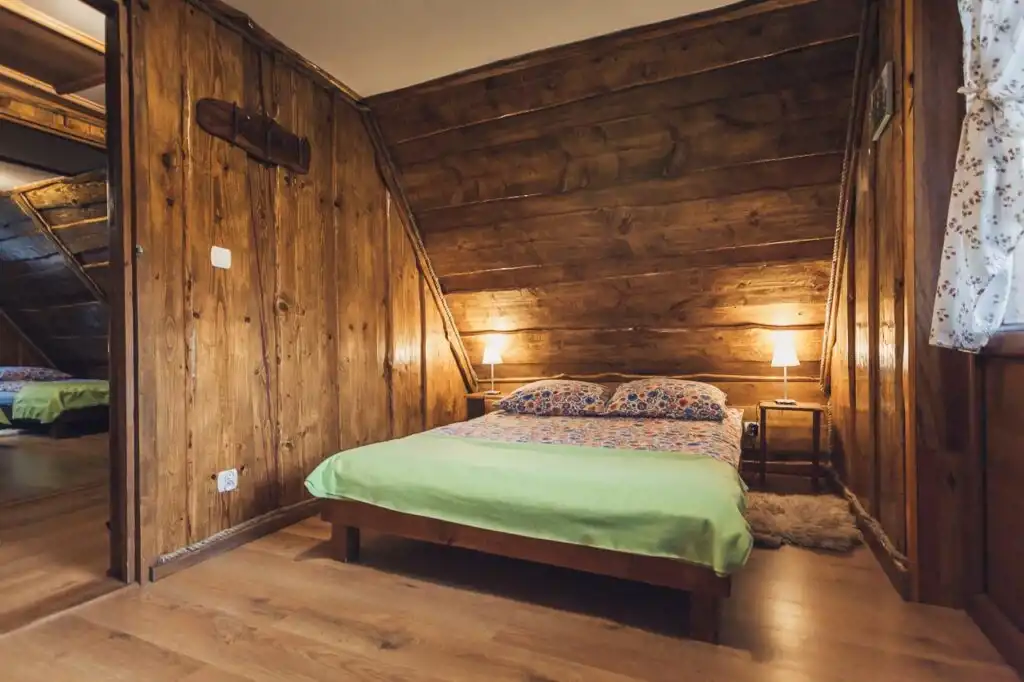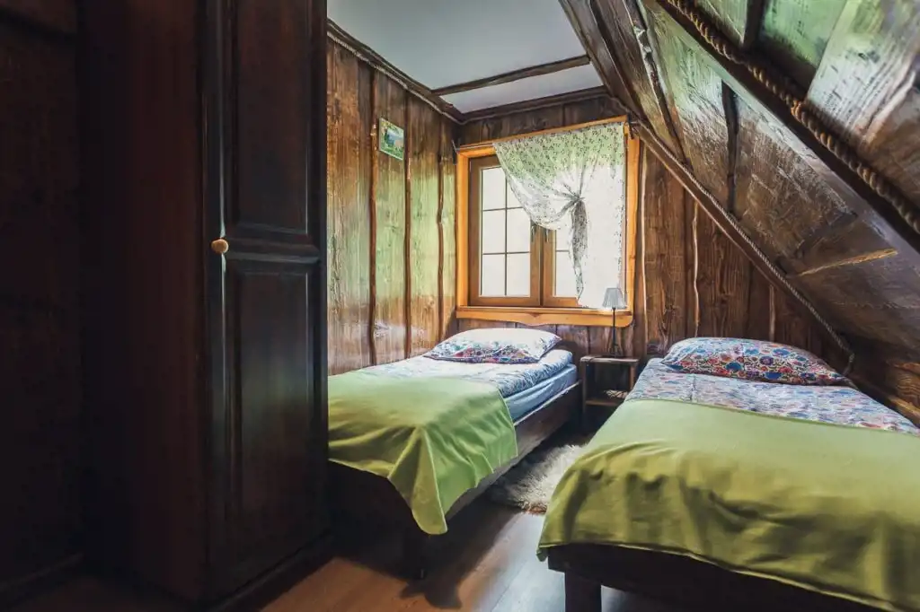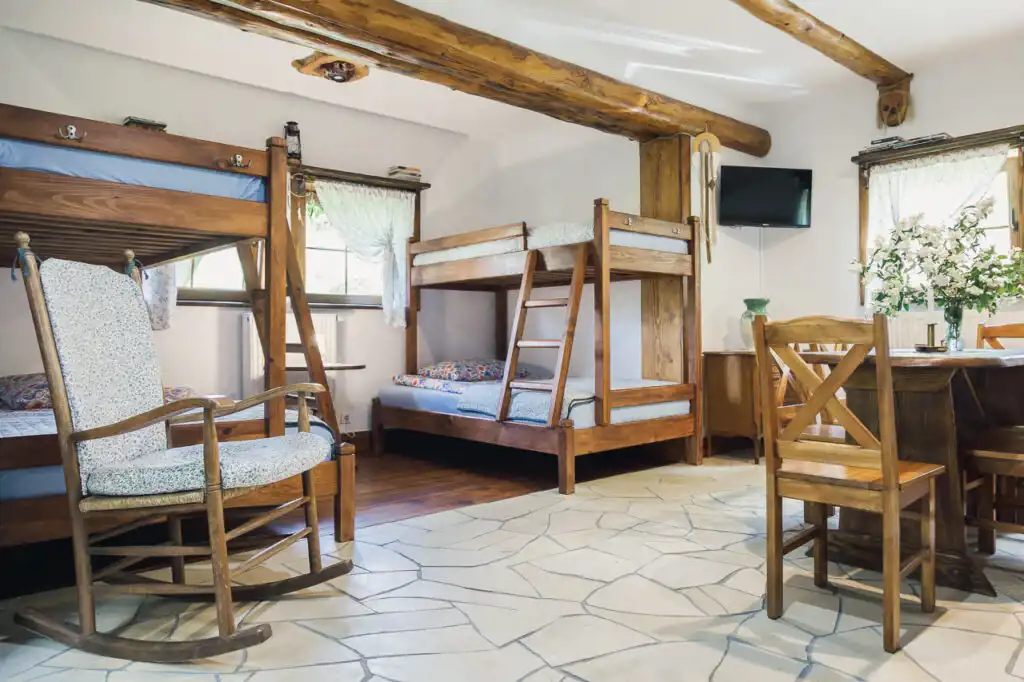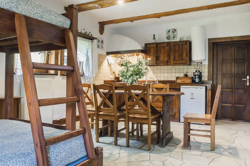 W apartamencie znajduje się aneks kuchenny z piecem kaflowym, łóżka piętrowe i łazienka. Całość do wyłącznej dyspozycji gości.