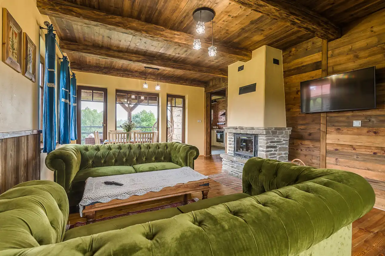 Budynki posiadają łącznie 5apartamentów, każdy z oddzielnym wejściem i zadaszonym obszernym tarasem. Każdy z apartamentów posiada salon z klimatycznym kominkiem, w pełni umeblowaną i przestronną kuchnię (płyta, piekarnik, zmywarka, lodówka), umeblowane tarasy w komplety wypoczynkowe i kokony, sypialnie i łazienki(których ilość dopasowana jest do liczby gości)
