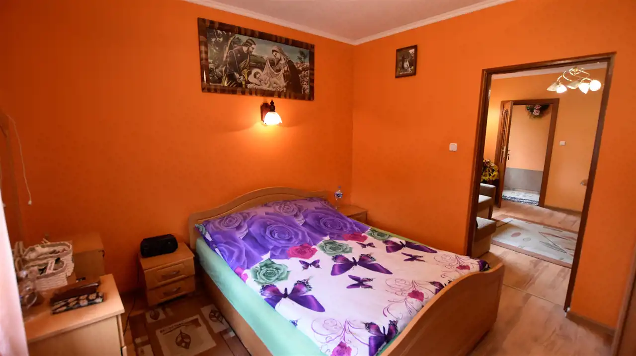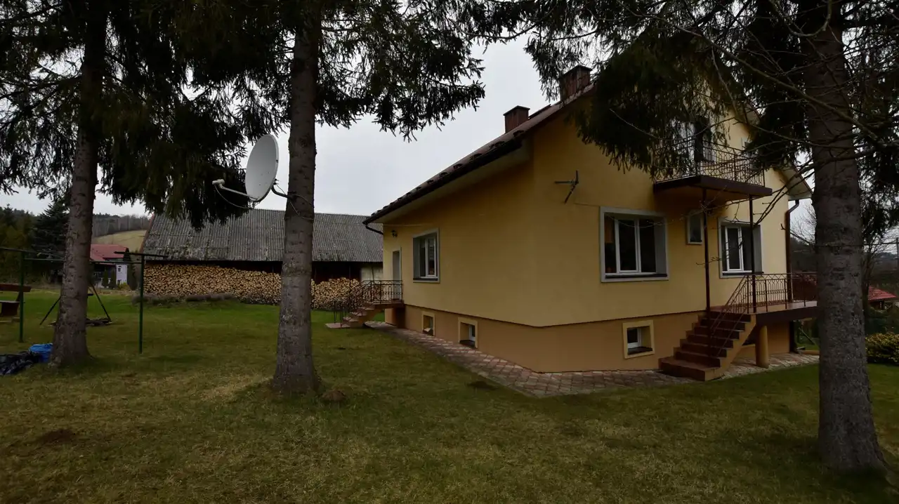 Budynek mieszkalny z lat 50- tych, wybudowany w technologii tradycyjnej murowanej z dużym zadaszonym tarasem zewnętrznym o pow. około 18 m2. Fundament betonowy, ściany budynku wykonane z pustaka murowanego na zaprawie cementowo- wapiennej, ocieplone styropianem 12 cm i otynkowane, dach konstrukcji drewnianej ocieplony wełną mineralną, pokrycie dachu blacha. Okna w całym budynku plastikowe. Podłogi wewnątrz wykończone panelami oraz płytkami. Teren działki ogrodzony i zagospodarowany na którym występują pojedyncze drzewa.