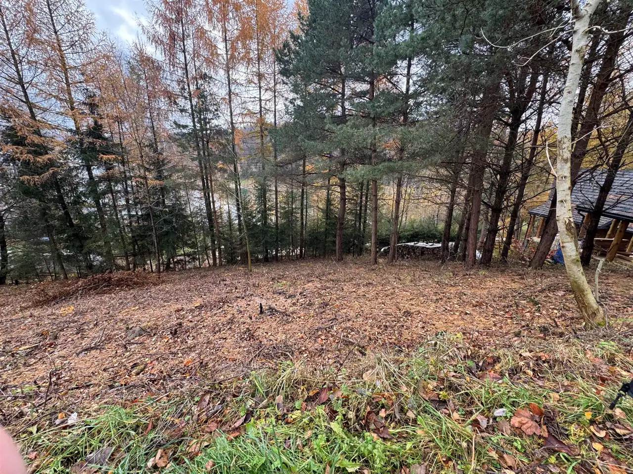Działka nachylona w kierunku jeziora, co daje możliwości podziwiania pięknych widok o każdej porze roku, z dostępem do drogi w kształcie trapezu o wymiarach ok. 39,5 m x 15,5 m x 41,5 m x 23 m. Jest to ostania
