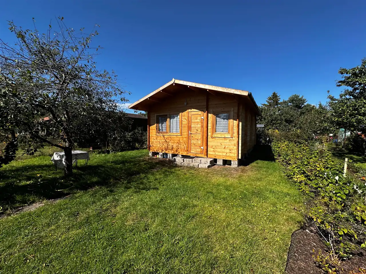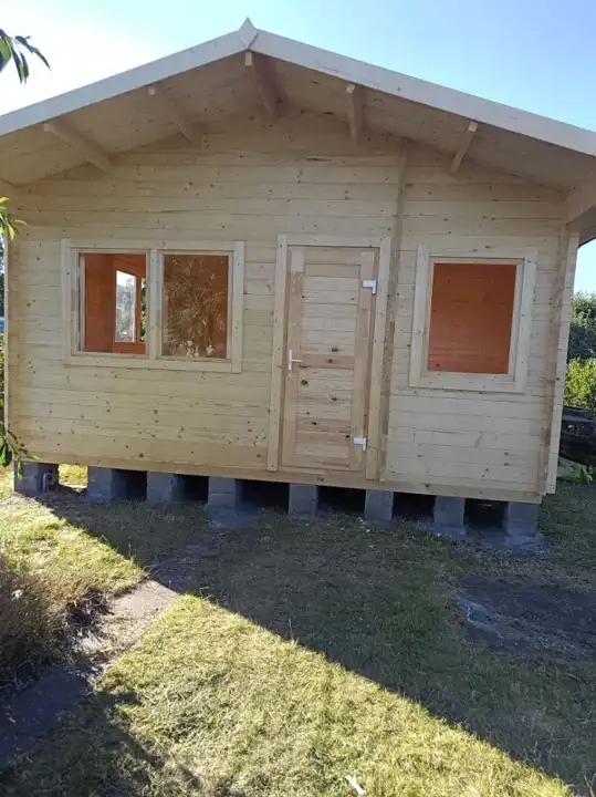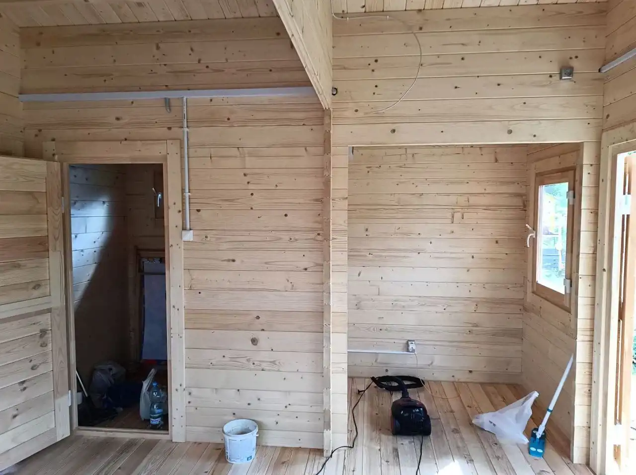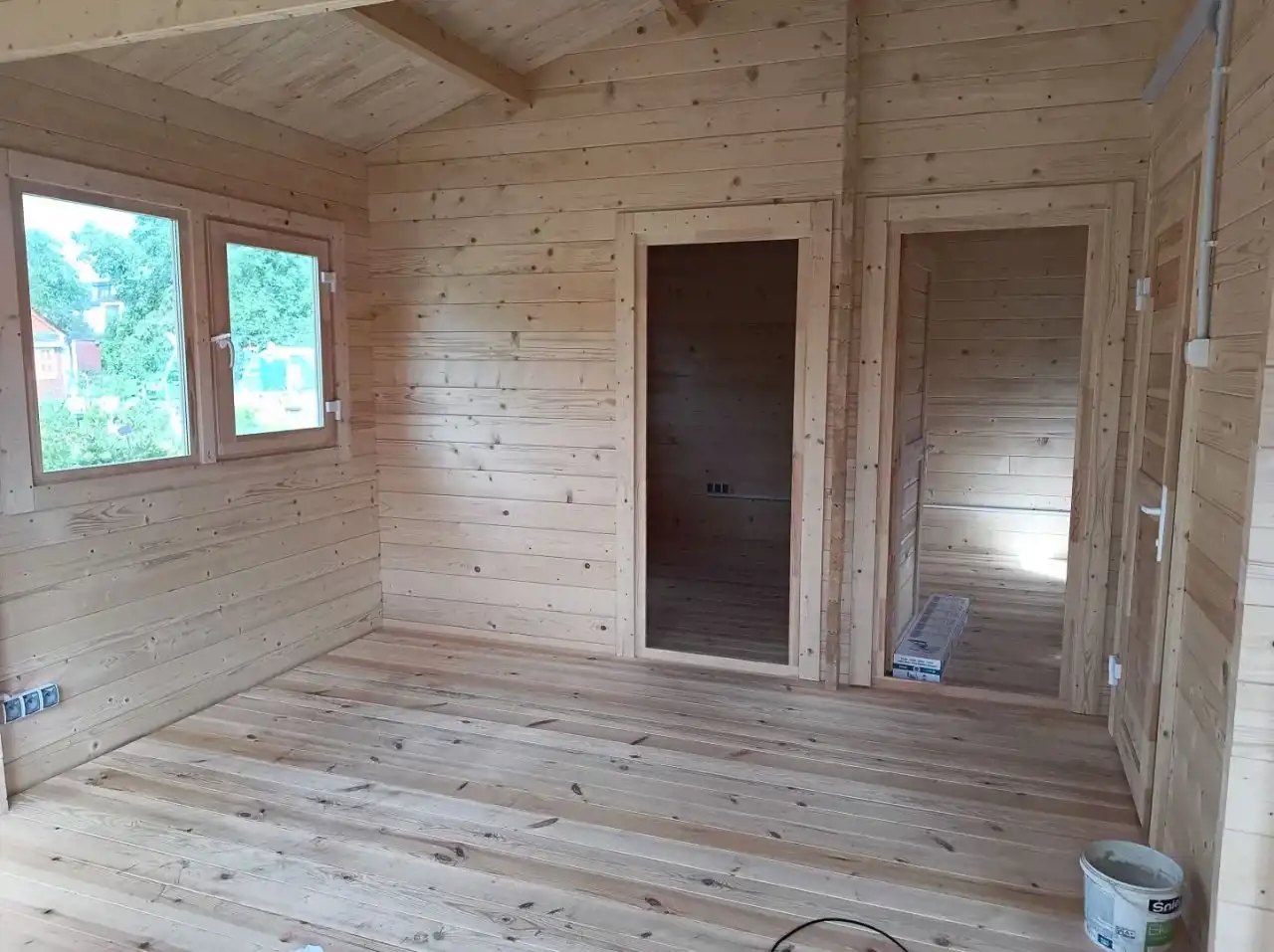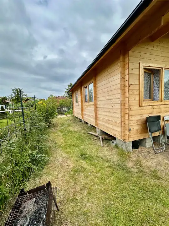Domek o powierzchni 35 m2 postawiony został na początku lipca 2024 - drewniany domek z sosny (grubość deski 46 mm). Jak wiadomo sosna jest bardzo zdrowa, dobrze się nią oddycha, a także duży plus: komary nie lubią zapachu sosny.