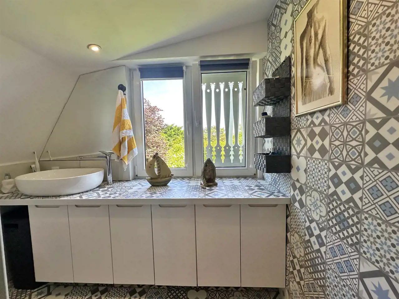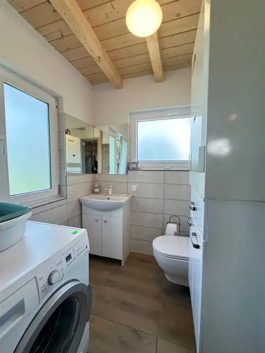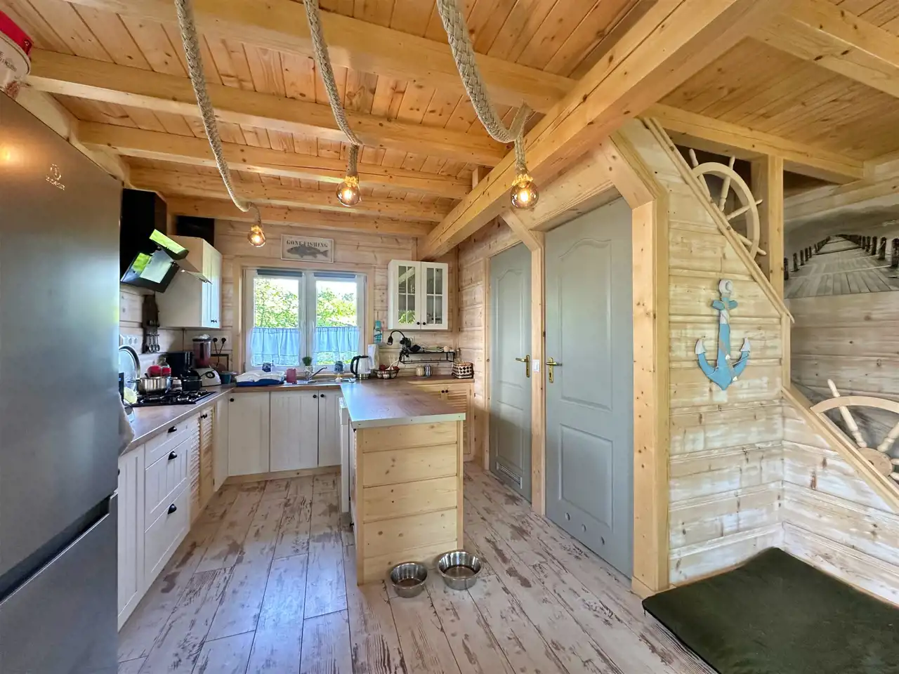 Na parterze znajduje się przestronny salon z aneksem kuchennym kompletnie wyposażonym, oraz łazienka. ( pralka, lodówka, zmywarka, kuchenka ) Ogrzewanie podłogowe. Przed wejściem niewielki taras.