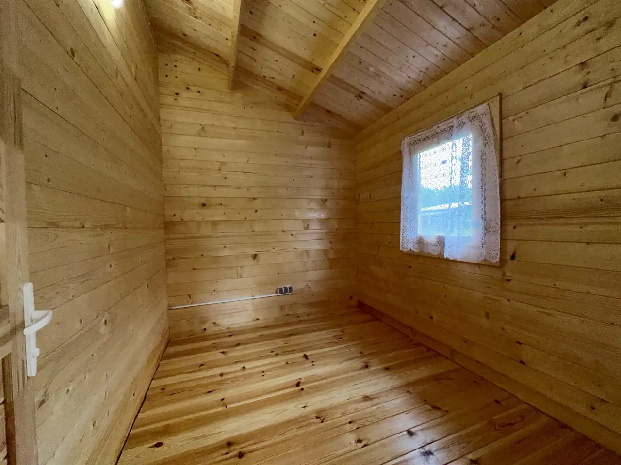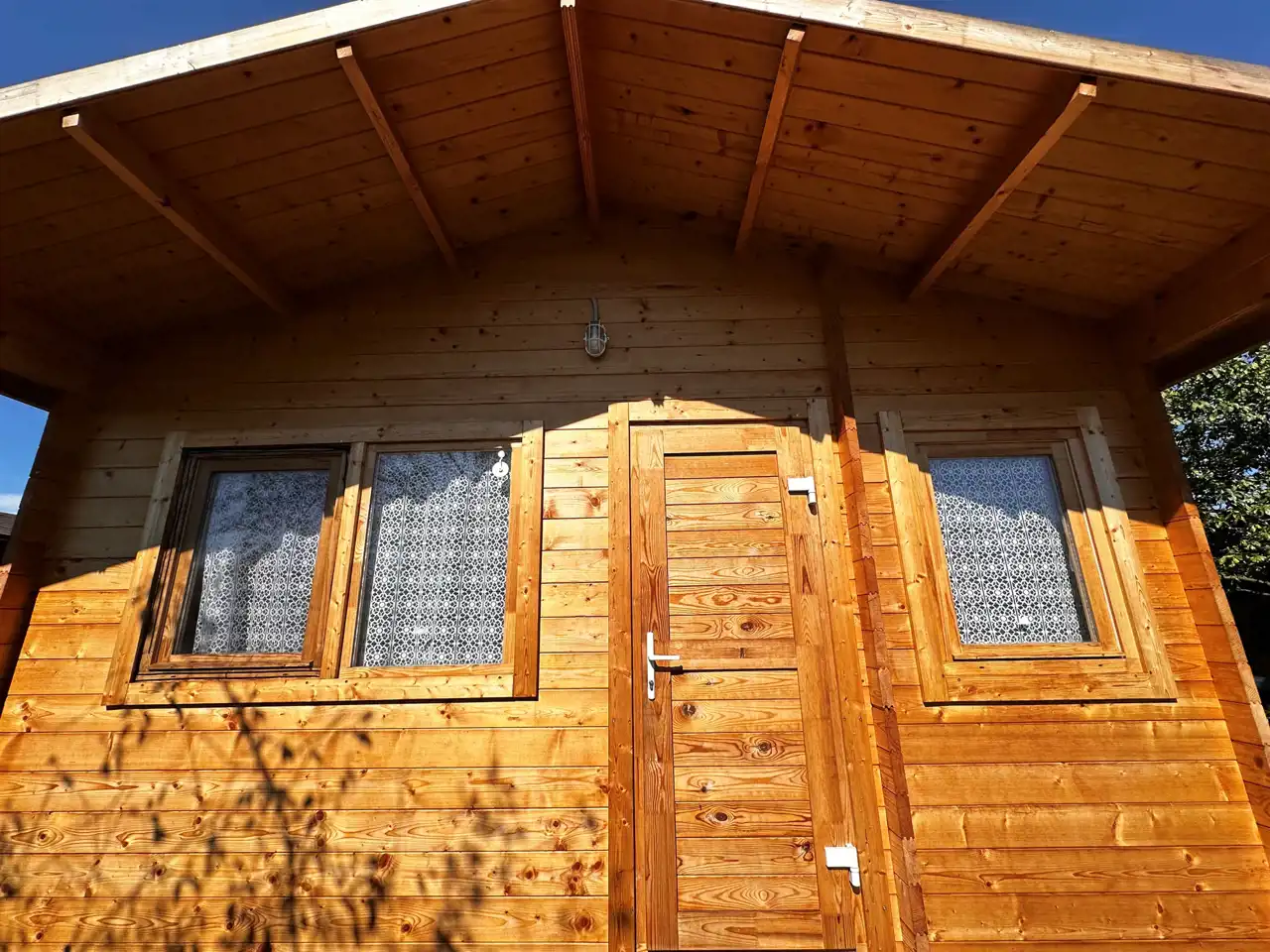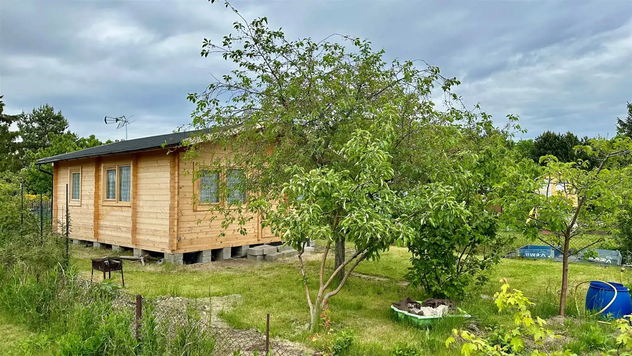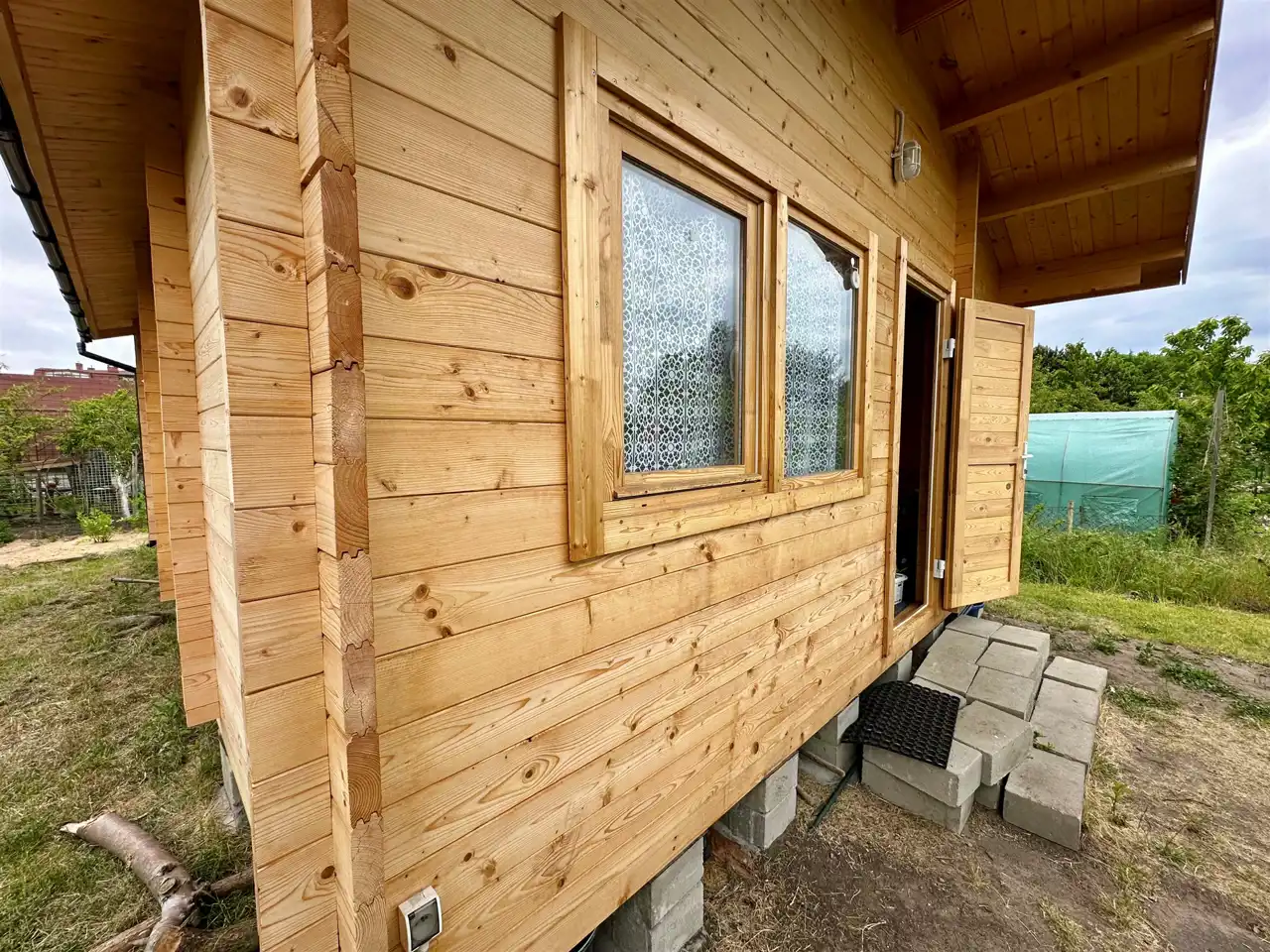 Domek o powierzchni 35 m2 postawiony został na początku lipca 2024 - drewniany domek z sosny (grubość deski 46 mm). Jak wiadomo sosna jest bardzo zdrowa, dobrze się nią oddycha, a także duży plus: komary nie lubią zapachu sosny.