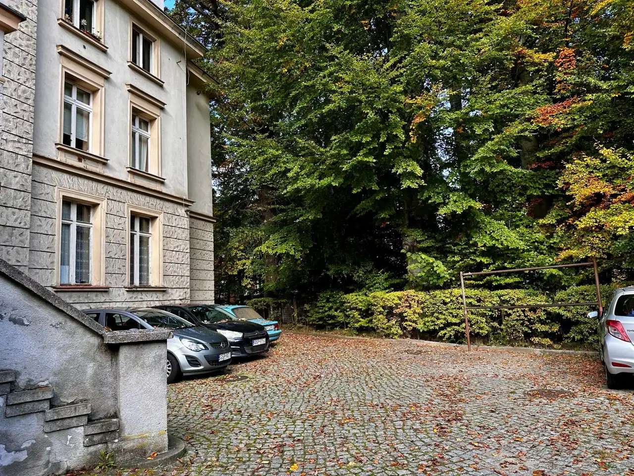 Na ogrodzonej posesji miejsca parkingowe.
