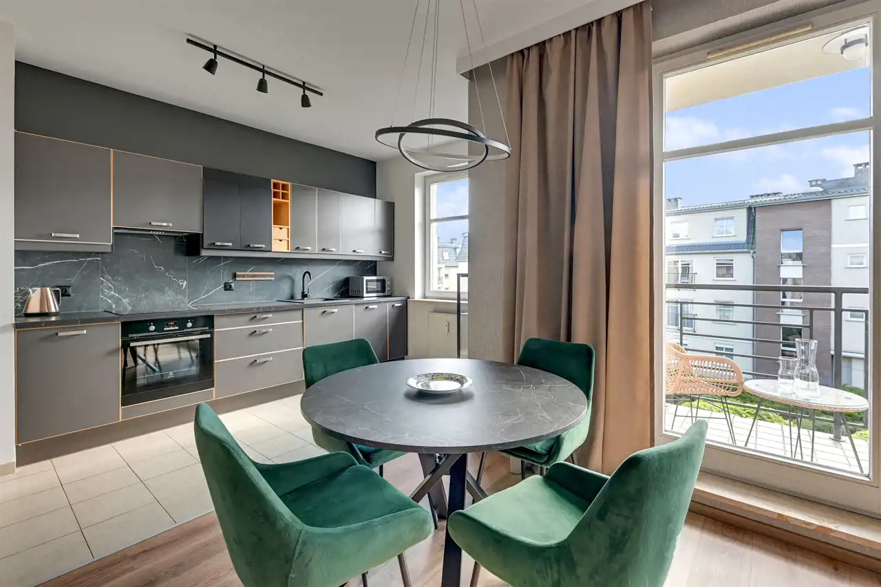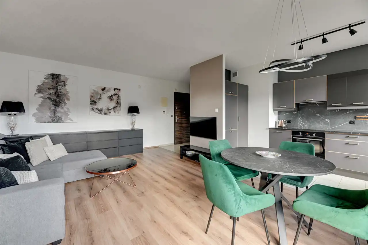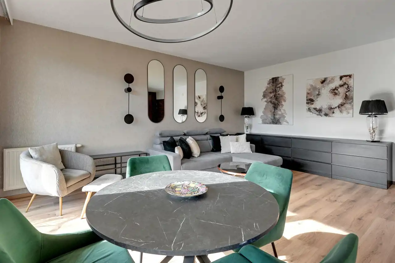 A modern, newly renovated apartment consisting of a living room with a kitchenette, bedroom, bathroom and hall, the total area of the property is 60 m2. The main part of the apartment is a spacious living room, a place for everyday relaxation and rest, with access to a spacious terrace. There is a sofa (pictures of the current graphite sofa are among the photos of the property), armchair, coffee table, and on the other side a TV. The shades of gray and beige, which are dominant in this part of the apartment, are enlivened with bottle green. A little further, there is a round table with chairs that separates the dining area and also leads to the kitchen area. We have a built-in kitchenette there, equipped with the necessary household appliances, black, matte fronts of cabinets with an admixture of copper color add class and elegance. Cozy bedroom with a large bed in a hotel style, next to bedside tables, a chest of drawers and a spacious built-in wardrobe. In the bathroom there is a shower with a rain shower, a washbasin, a toilet and a washing machine, stylish tiles with a marble structure on the floor and walls. The apartment is decorated according to the prevailing trends, ideal for people with a sense of style, who value comfort and convenience.