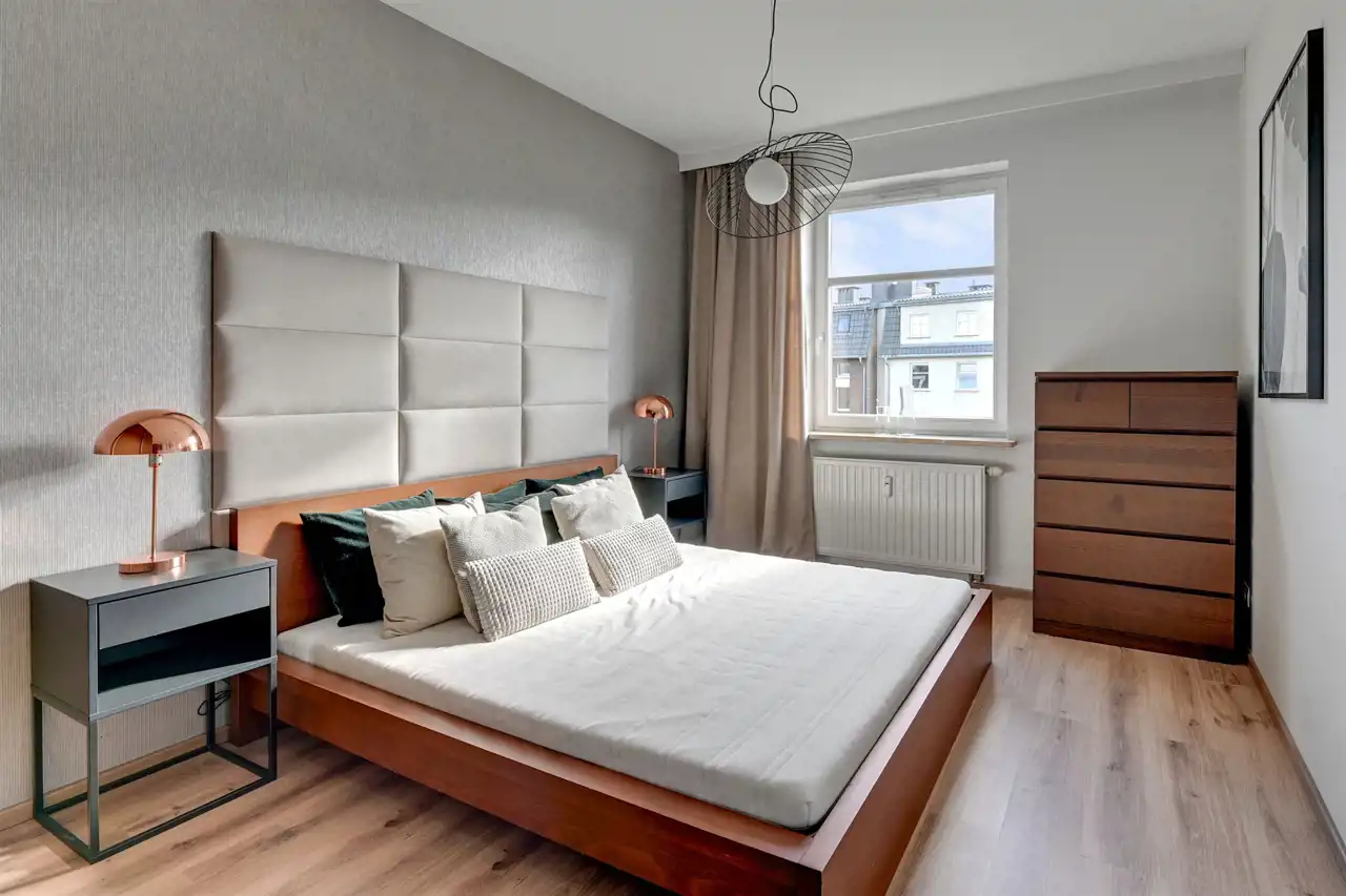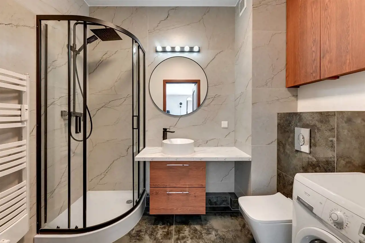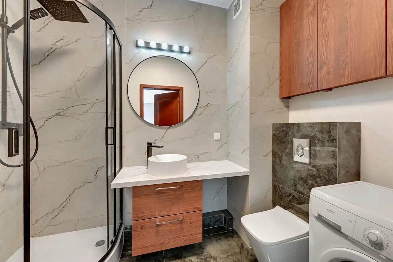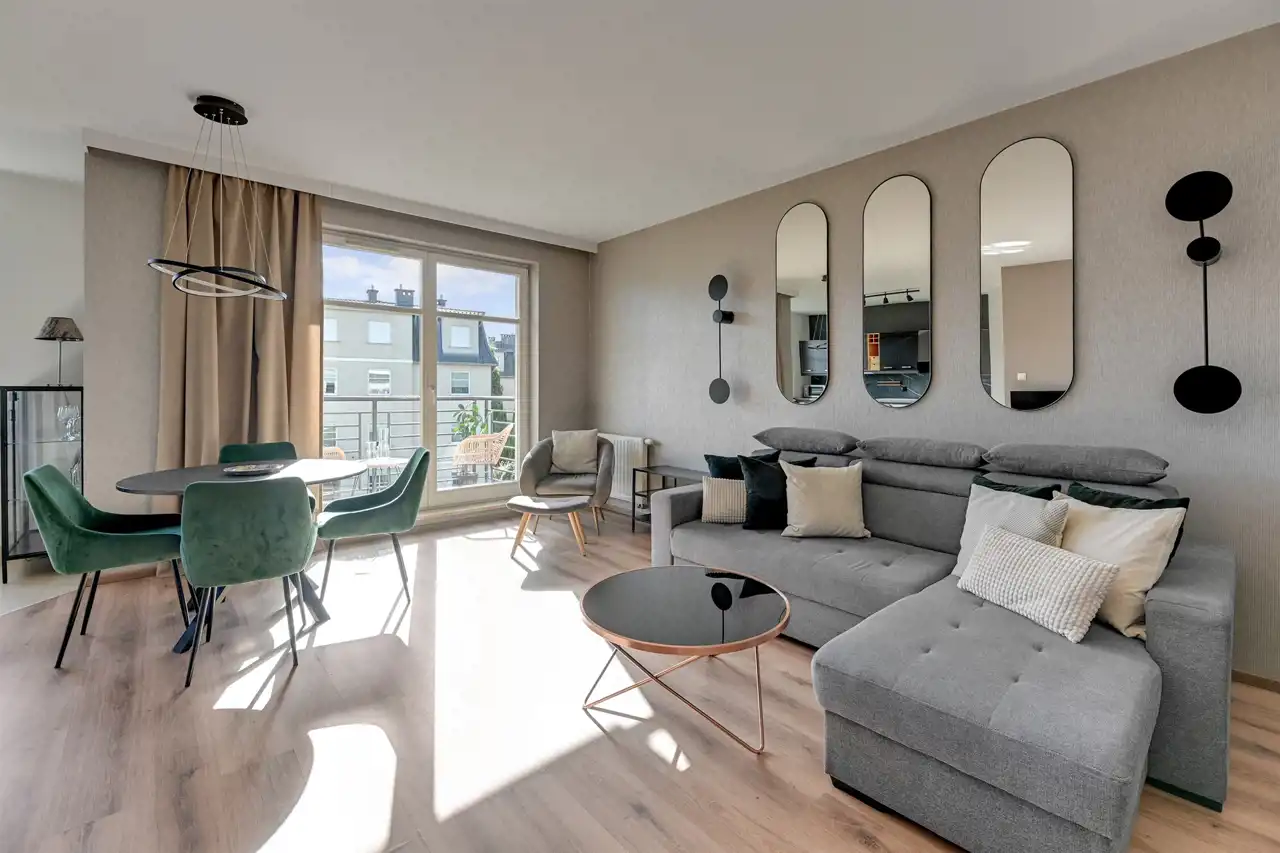 A modern, newly renovated apartment consisting of a living room with a kitchenette, bedroom, bathroom and hall, the total area of the property is 60 m2. The main part of the apartment is a spacious living room, a place for everyday relaxation and rest, with access to a spacious terrace. There is a sofa (pictures of the current graphite sofa are among the photos of the property), armchair, coffee table, and on the other side a TV. The shades of gray and beige, which are dominant in this part of the apartment, are enlivened with bottle green. A little further, there is a round table with chairs that separates the dining area and also leads to the kitchen area. We have a built-in kitchenette there, equipped with the necessary household appliances, black, matte fronts of cabinets with an admixture of copper color add class and elegance. Cozy bedroom with a large bed in a hotel style, next to bedside tables, a chest of drawers and a spacious built-in wardrobe. In the bathroom there is a shower with a rain shower, a washbasin, a toilet and a washing machine, stylish tiles with a marble structure on the floor and walls. The apartment is decorated according to the prevailing trends, ideal for people with a sense of style, who value comfort and convenience.