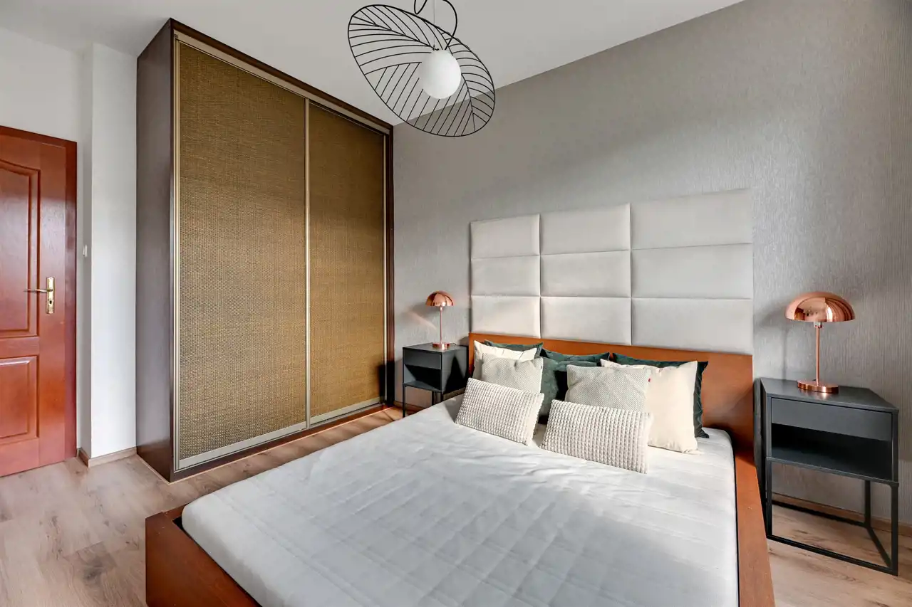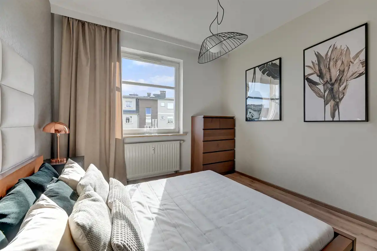 Nowoczesny, świeżo wyremontowany apartament składający się z salonu połączonego z aneksem kuchennym, sypialni, łazienki oraz przedpokoju, łączna powierzchnia nieruchomości to 60 m2. Główną część mieszkania stanowi przestronny salon, miejsce do codziennego relaksu i odpoczynku, z wyjściem na przestronny taras. Znajduję się tam sofa (zdjęcia aktualnej, grafitowej kanapy znajdują się wśród zdjęć nieruchomości) fotel, stolik kawowy, a po drugiej stronie telewizor. Dominujące w tej części mieszkania odcienie szarości i beżu ożywione zostały kolorem butelkowej zieleni. Nieco dalej okrągły stół z krzesłami, który wydziela strefę jadalnianą i wprowadza zarazem do części kuchennej. Mamy tam aneks w zabudowie, wyposażony w niezbędny sprzęt AGD, czarne, matowe fronty szafek z domieszka koloru miedzianego dodają klasy i elegancji. Sypialnia przytulna z dużym łóżkiem w hotelowym stylu, obok szafki nocne, komoda oraz pojemna szafa wnękowa. W łazience prysznic z deszczownicą, umywalka, WC oraz pralka, na podłodze oraz ścianach stylowe kafle o strukturze marmuru. Apartament urządzony wedle panujących trendów, idealny dla osób z poczuciem stylu, ceniących komfort i wygodę.