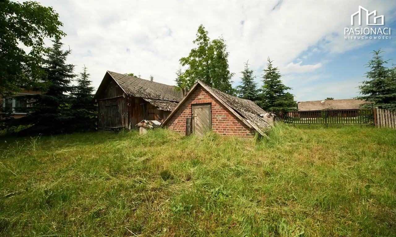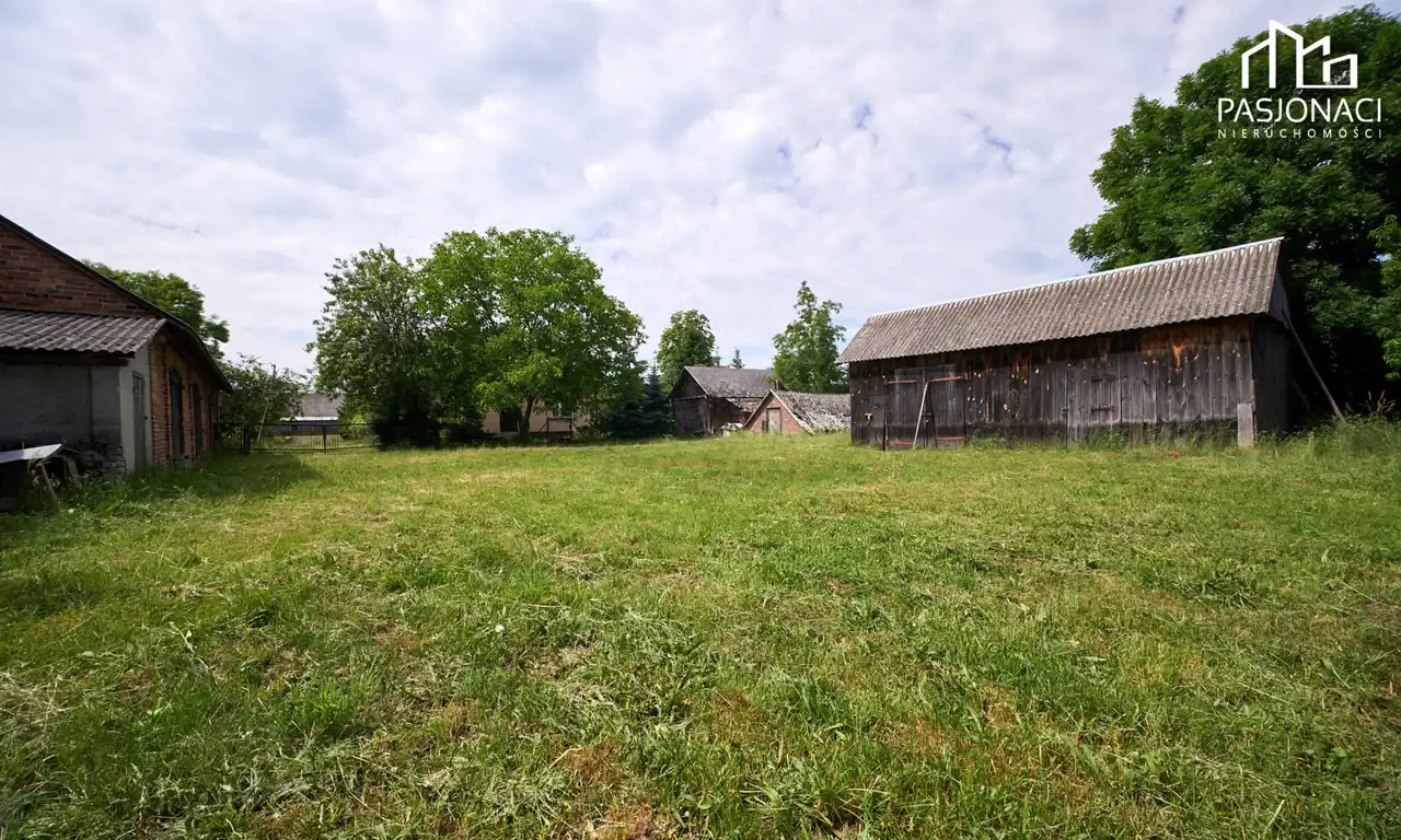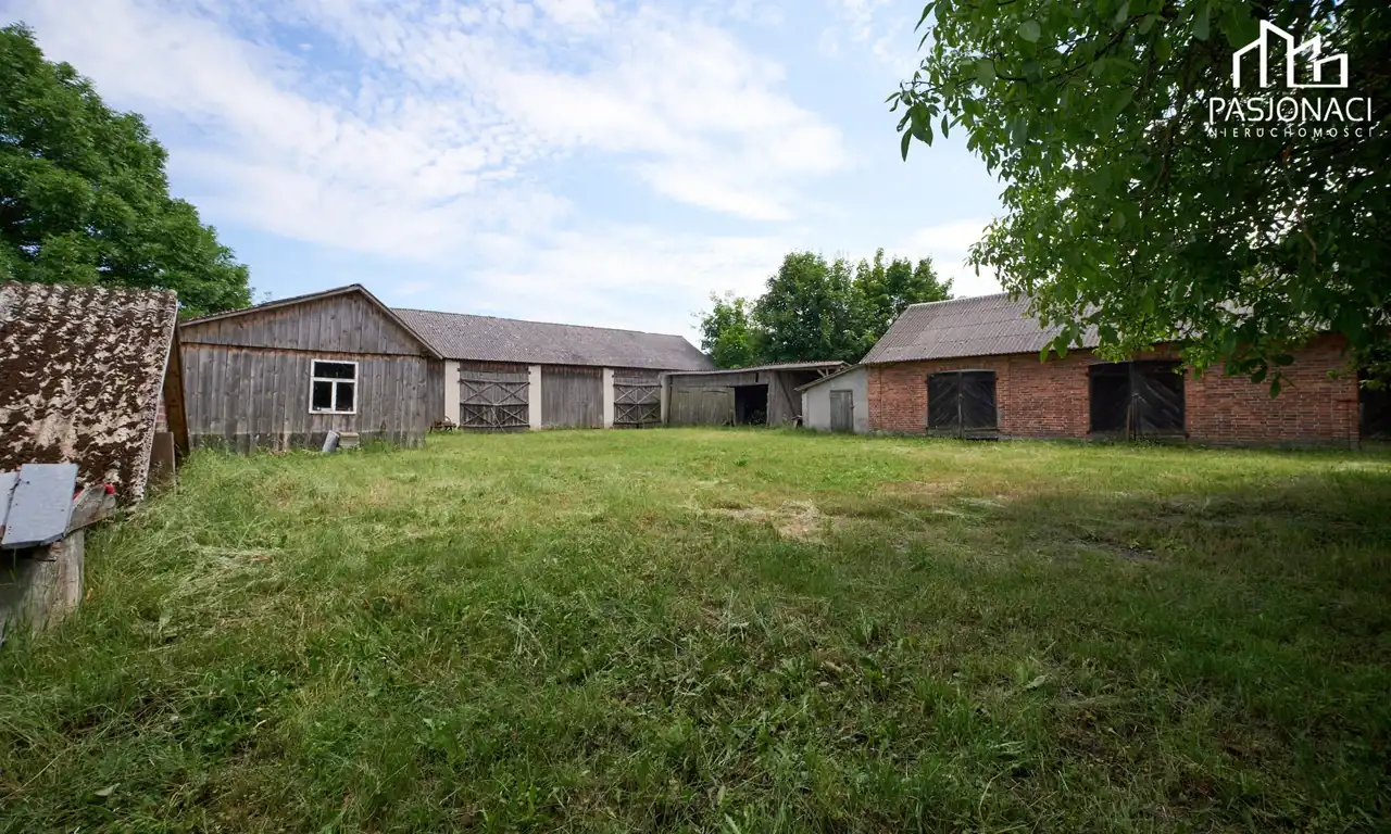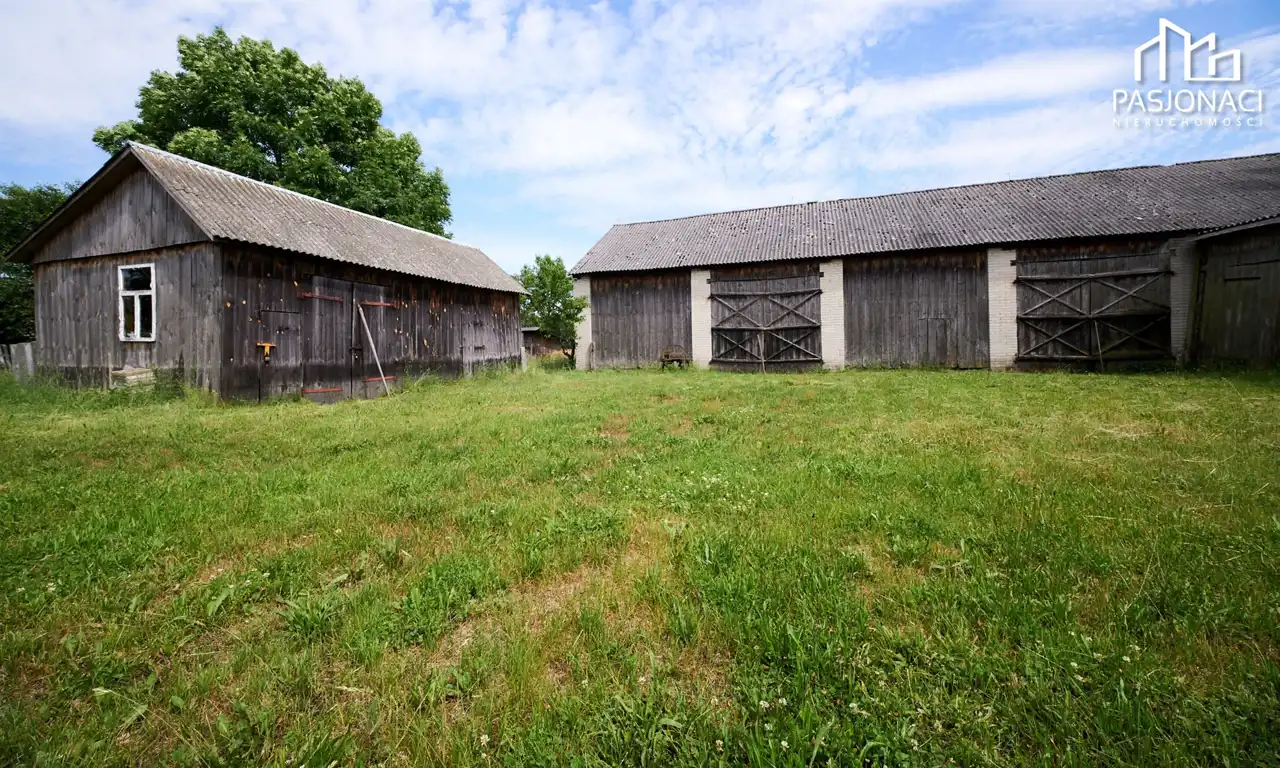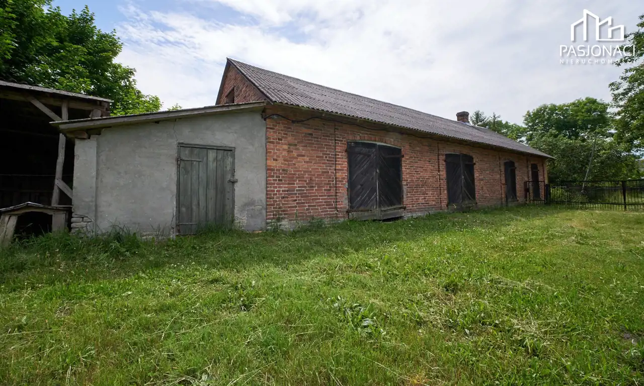 Na terenie znajduje się stodoła z murowanymi filarami, murowana piwnica oraz obora, które mogą służyć jako przestrzeń magazynowa lub do prowadzenia działalności gospodarczej. Dodatkowo, na działce znajduje się komórka, suszarnia na drewno oraz kręgowa studnia i szambo.