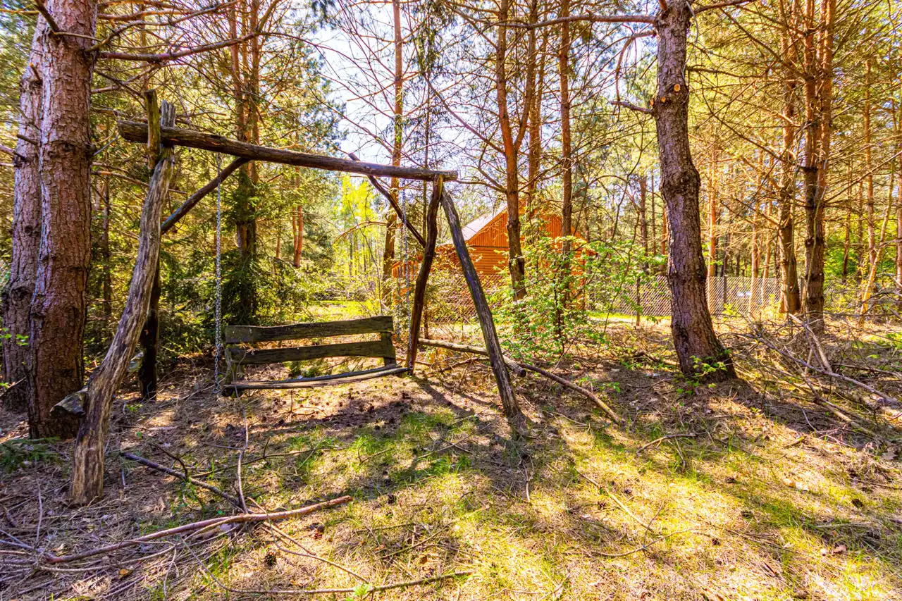 Przed domkiem znajduje się teren wyłożony kamieniami, co nadaje mu charakteru i stwarza miejsce na relaks i odpoczynek na powietrzu. Na działce znajduje się mnóstwo drzew iglastych, co zapewnia cień i ochłodę w gorące letnie dni.