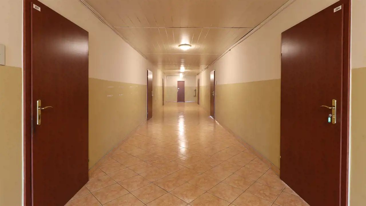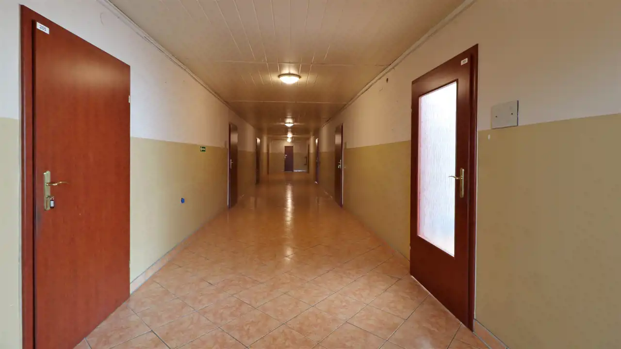 Korytarz z biurami po obu stronach budynku