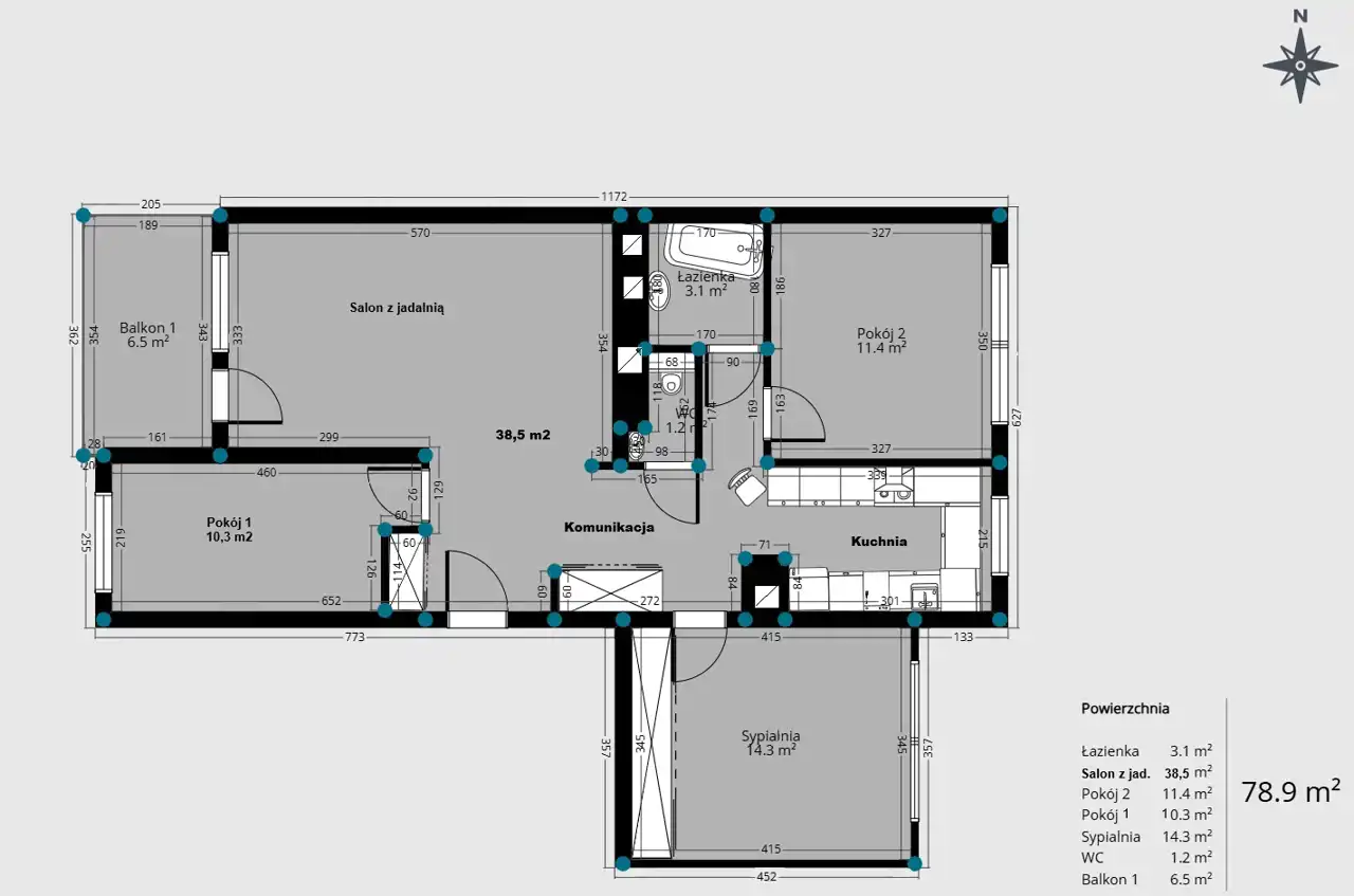 - Charakterystyka mieszkania 78.9 m2, 4 pokoje