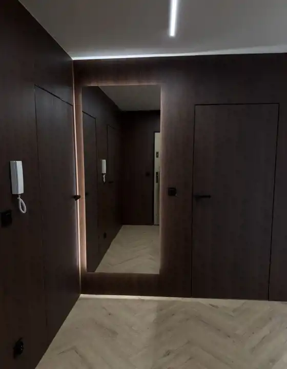 Przedpokój z dużą szafą wnękową — maksymalne wykorzystanie dostępnej przestrzeni.