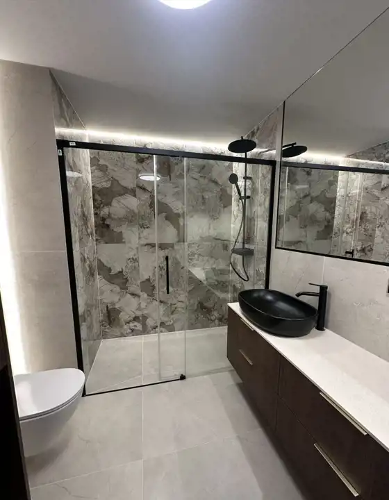 Nowoczesna łazienka — z zabudową meblową wykonywaną na zamówienie.