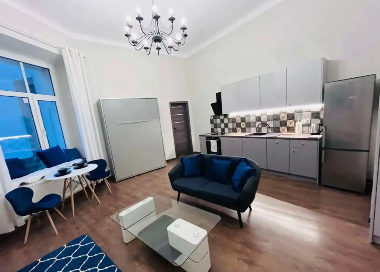 Mieszkanie jest po generalnym remoncie i składa się z przestronnego pokoju z aneksem kuchennym oraz z łazienki z wc. Jest w pełni wyposażone i gotowe do zamieszkania. Dodatkową zaletą jest pełnowymiarowe łóżko sypialniane ukryte w szafie, które za jednym ruchem ręki zamienia sypialnię w salon.