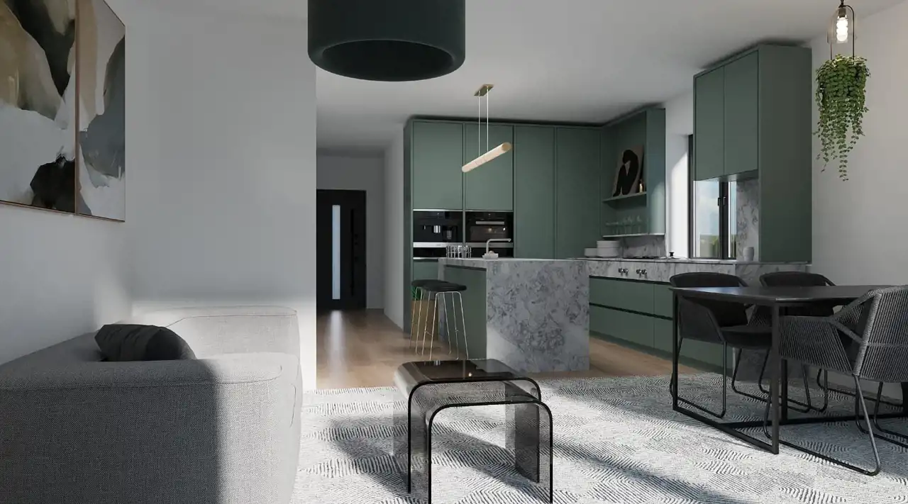 Wiatrołap (3,60 m²), łazienka (2,18 m²), salon z jadalnią i kuchnią (30,39 m²) oraz dodatkowy pokój o powierzchni 6,85 m², idealny na gabinet, pokój gościnny lub sypialnię.