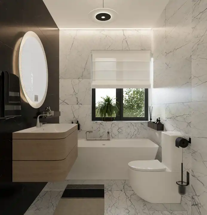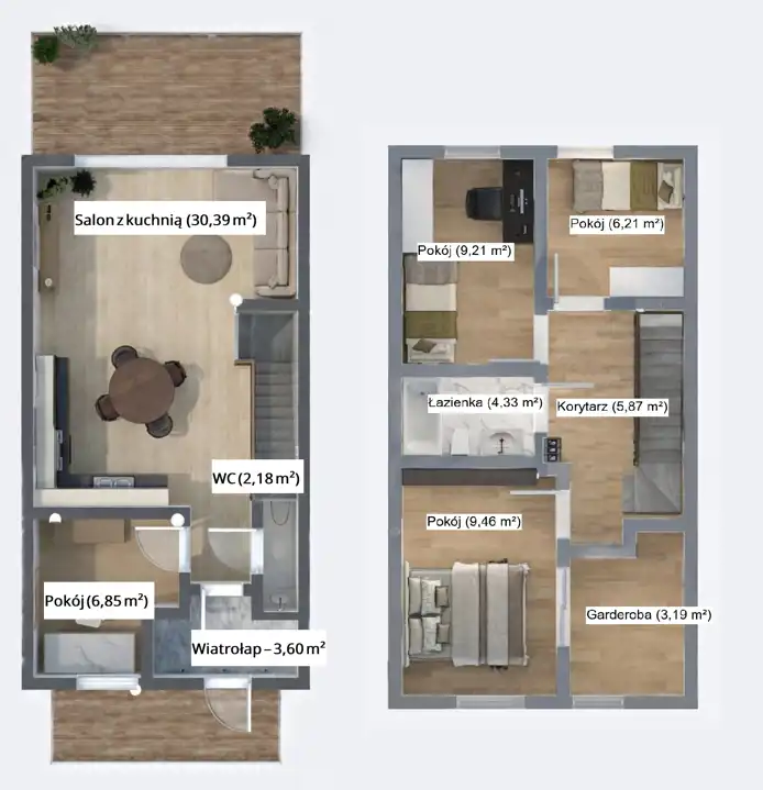 Wiatrołap (3,60 m²), łazienka (2,18 m²), salon z jadalnią i kuchnią (30,39 m²) oraz dodatkowy pokój o powierzchni 6,85 m², idealny na gabinet, pokój gościnny lub sypialnię.