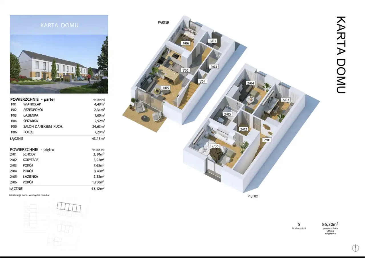 - Parter: wiatrołap (4,49 m²), pokój (7,20 m²), salon z aneksem kuchennym (26,97 m²), łazienka (1,60 m²), pomieszczenie gospodarcze (2,92 m²).