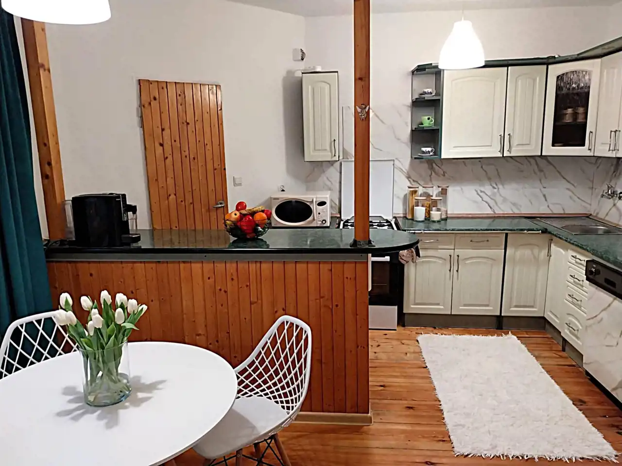 Mieszkanie obejmuje cały parter składający się z 2 pokoi, dużej kuchni z jadalnią, spiżarki, przedpokoju i łazienki.
