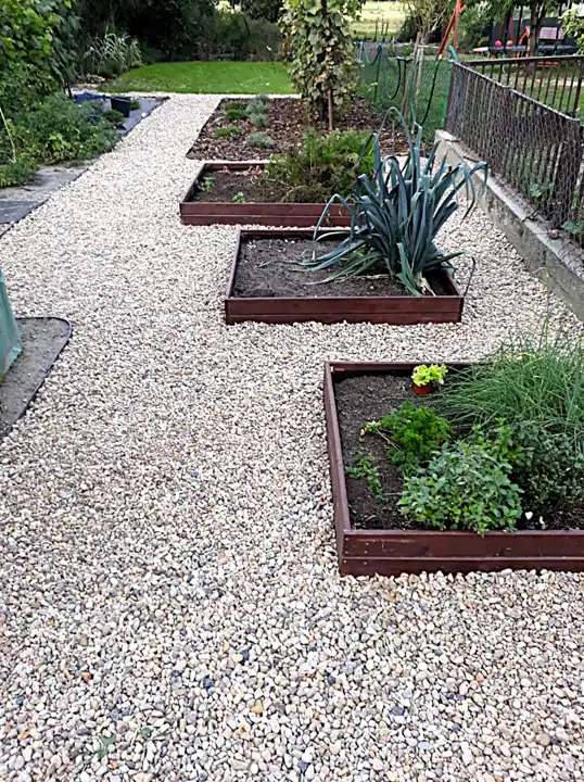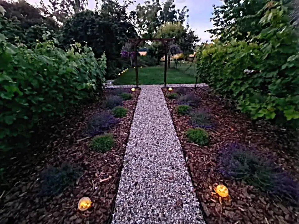 Zagospodarowana działka z licznymi różnorodnymi nasadzeniami.