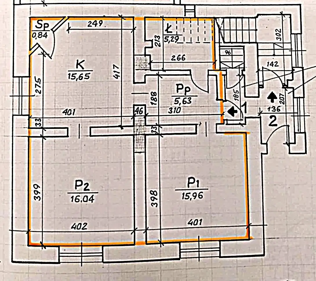 Pokoje o pow. 15,96 m2 i 16,04 m2, kuchnia 15,65 m2, przedpokój 5,63 m2, łazienka 5,29 m2 i spiżarka 0,84 m2.