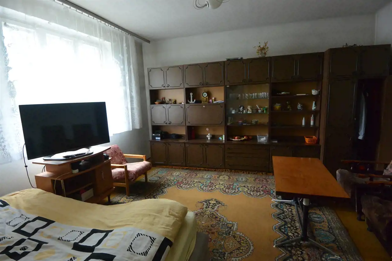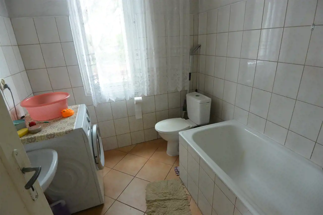 The windows are old-fashioned wooden double windows, the roof is covered with bituminous onduline, and the exterior walls are coated with textured plaster. The interior needs renovation. The building is partially basemented, and the attic can be adapted into additional living space. The house has been partially renovated, with panel flooring installed.