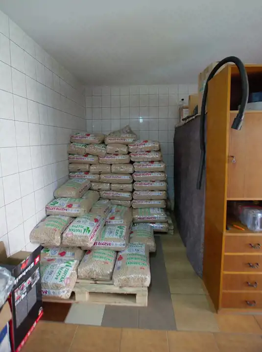 Dodatkowo na terenie posesji zlokalizowany jest murowany budynek gospodarczy (również po generalnym remoncie) w którym znajdują się następujące pomieszczenia: gabinet, spiżarnia, kotłownia (piec na pellet z 2023 roku), duży garaż na 2 samochody.