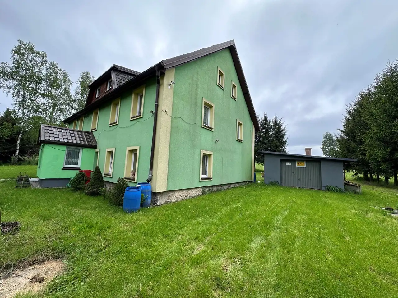Dom wolnostojący, niepodpiwniczony, piętrowy wraz z budynkiem garażowym na 2 samochody posadowiony na działce o powierzchni 971m2.
